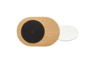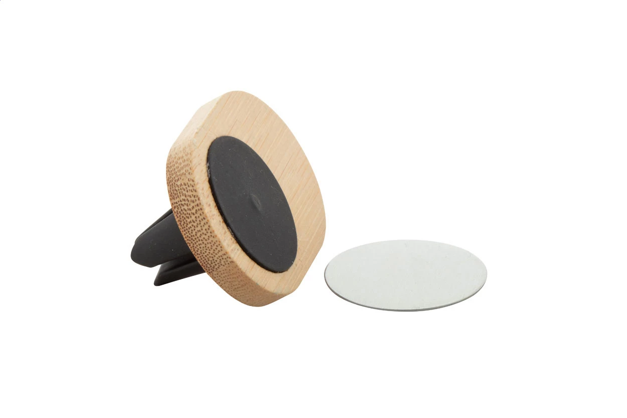 Bambusowy, magnetyczny uchwyt samochodowy na telefon z mocowaniem do kratki wentylacyjnej. Zawiera samoprzylepną metalową płytkę. W kartoniku.