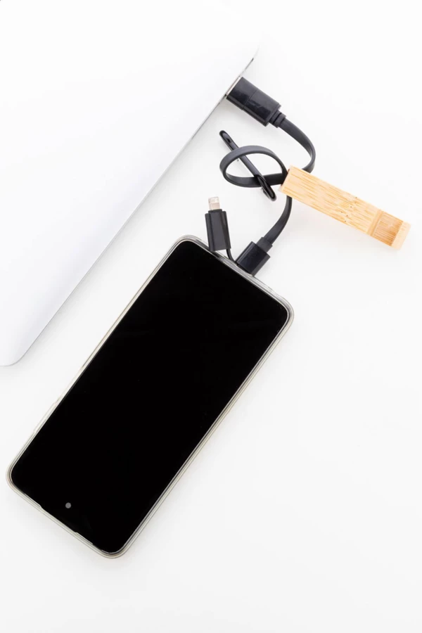 Kabel do ładowania USB z karabińczykiem z recyklingowanego aluminium i bambusowym uchwytem na telefon. Z wtyczkami micro USB, USB-C i Lightning. Z wejściami USB i USB-C.