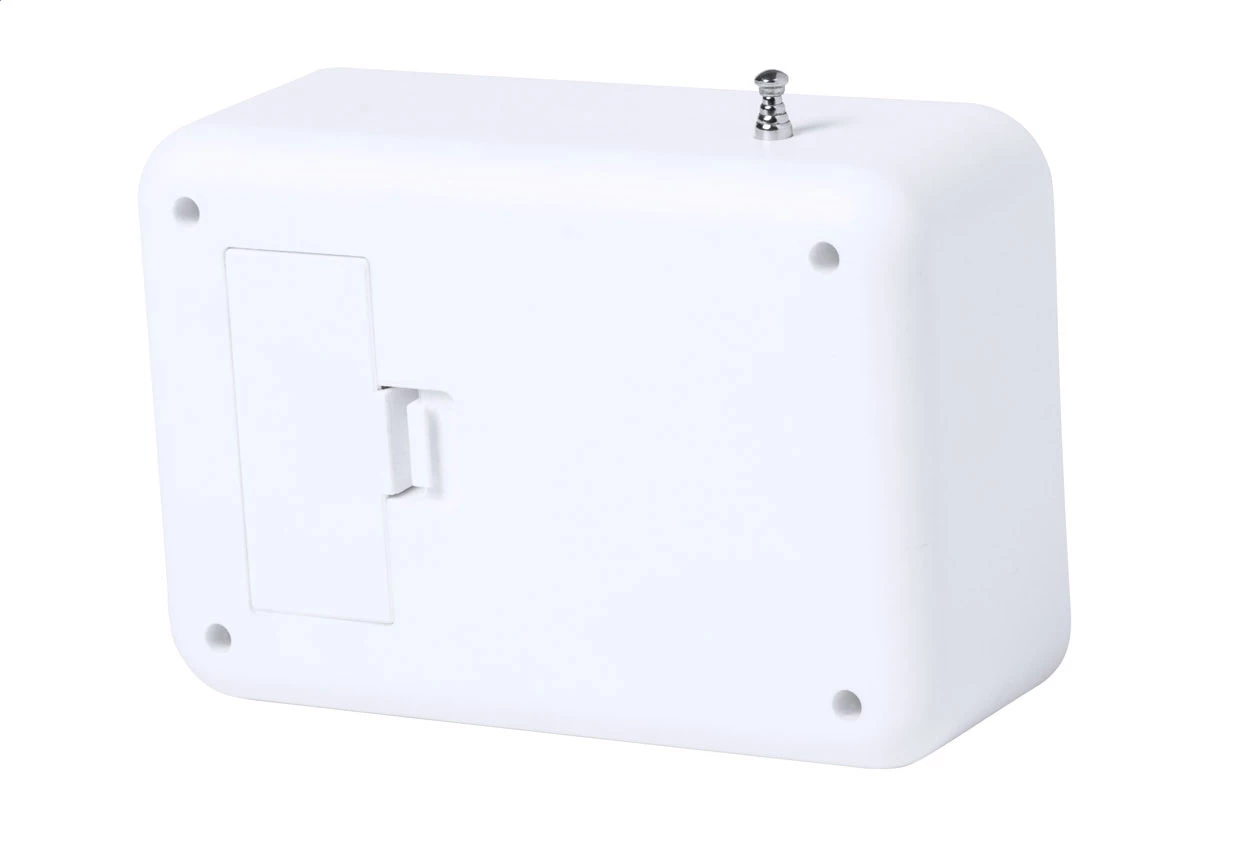 Bambusowy zegarek biurkowy z radiem FM, termometrem, kalendarzem i budzikiem. Zasilany 2 bateriami AAA. Brak baterii w zestawie.