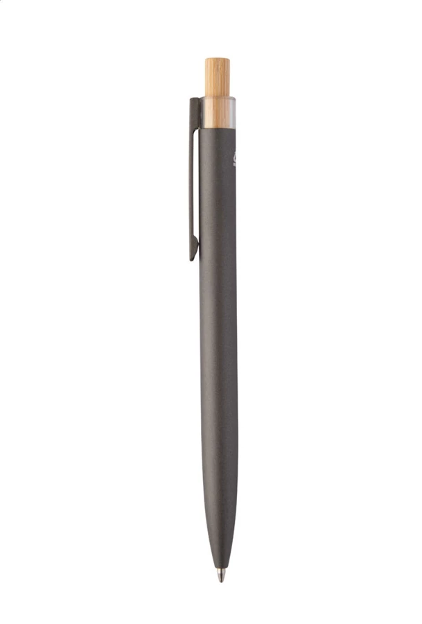 Aluminiowy długopis z recyklingu z bambusowym przyciskiem. Z niebieskim wkładem.