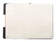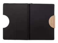 Notes pokryty poliestrem RPET z bambusową wkładką i podstawą na telefon. Z 80 kartkami w linie z papieru recykling, zakładką i gumowym paskiem. Rozmiar A5.