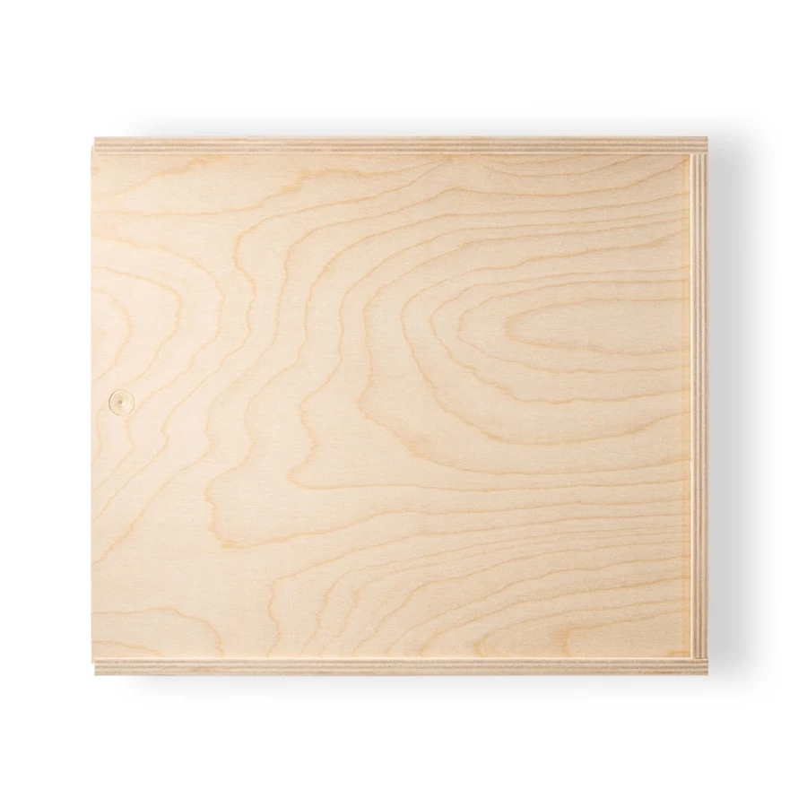 Pudełko ze sklejki z przesuwanym wieczkiem, również wykonanym ze sklejki brzozowej. Rozmiar L. Wewnątrz: 330 x 290 x 97 mm | Zewnętrzne: 348 x 308 x 111 mm