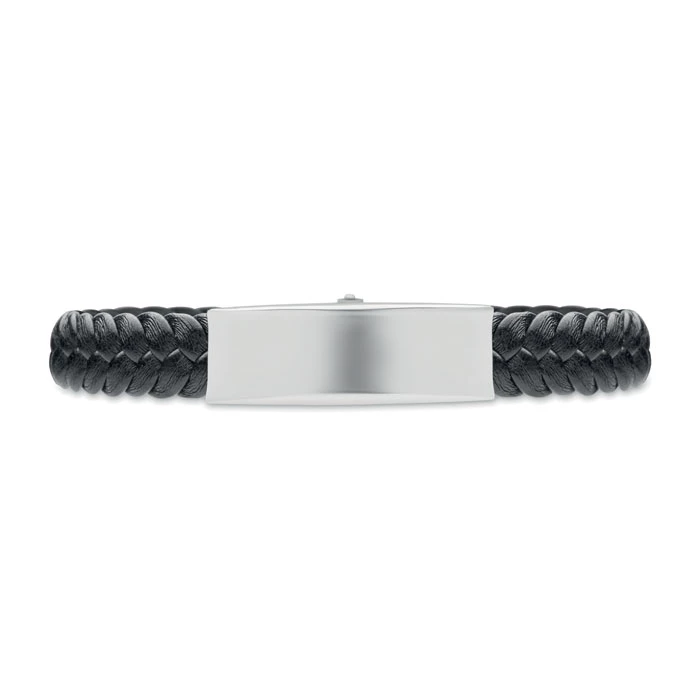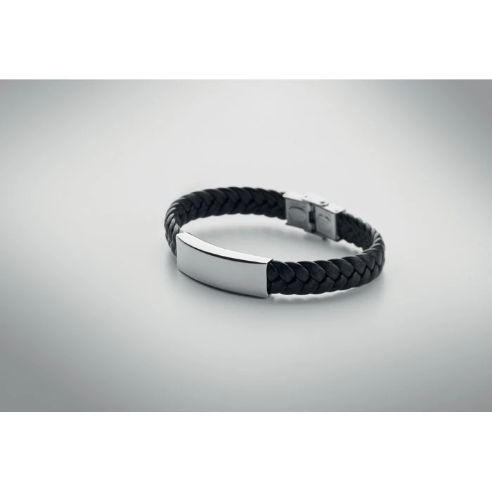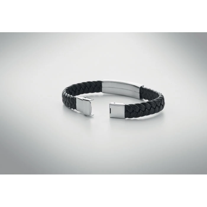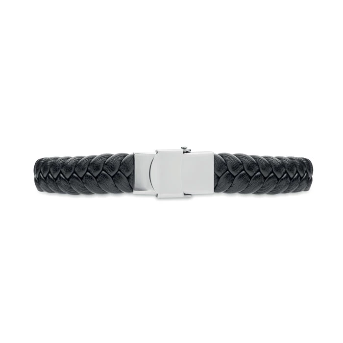 Pleciona bransoletka ze sztucznej skóry z okuciami z polerowanej stali. Zapięcie na zatrzask. Obwód nadgarstka: 21 cm.