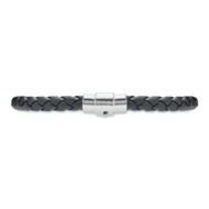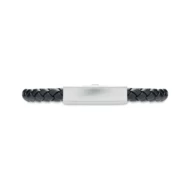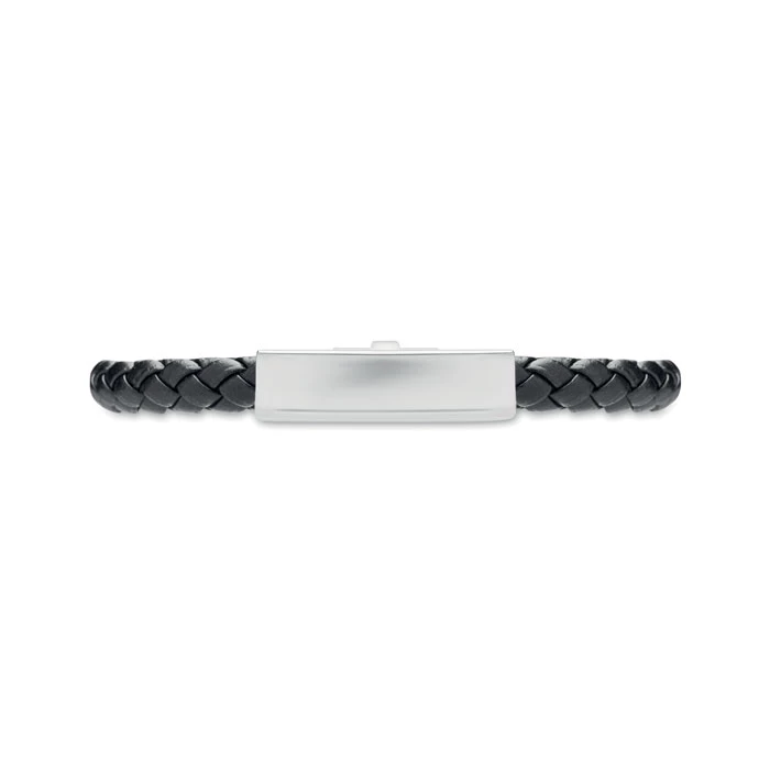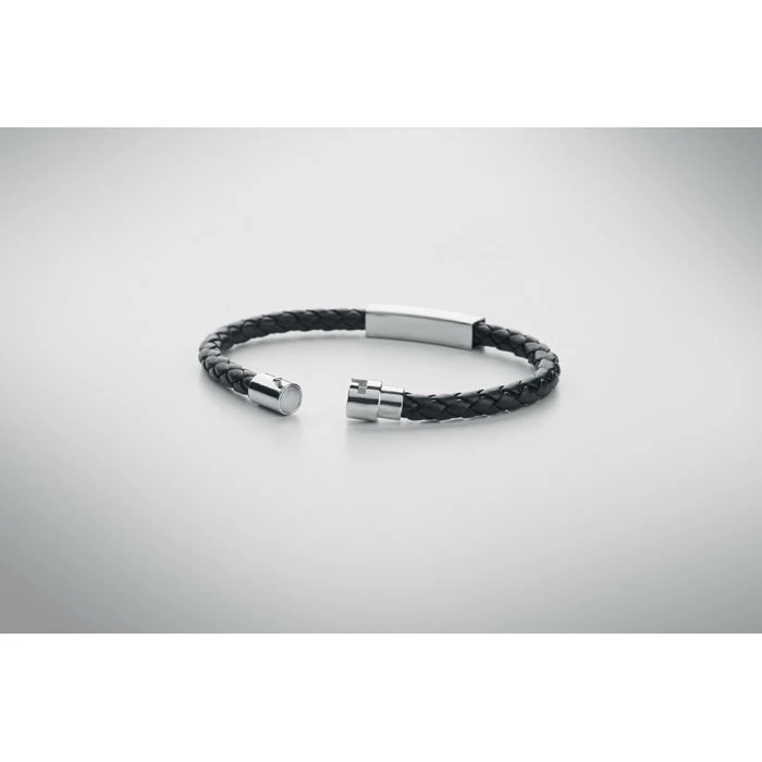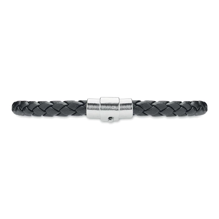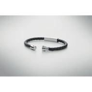 Pleciona bransoletka ze sztucznej skóry z okuciami z polerowanej stali. Zapięcie na zatrzask. Obwód nadgarstka: 19 cm.