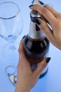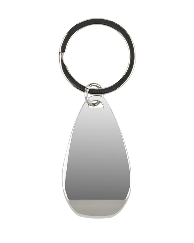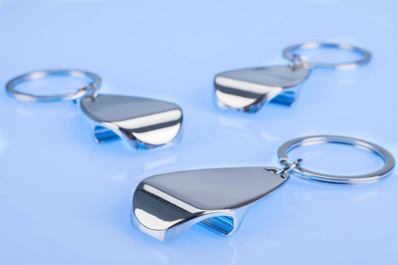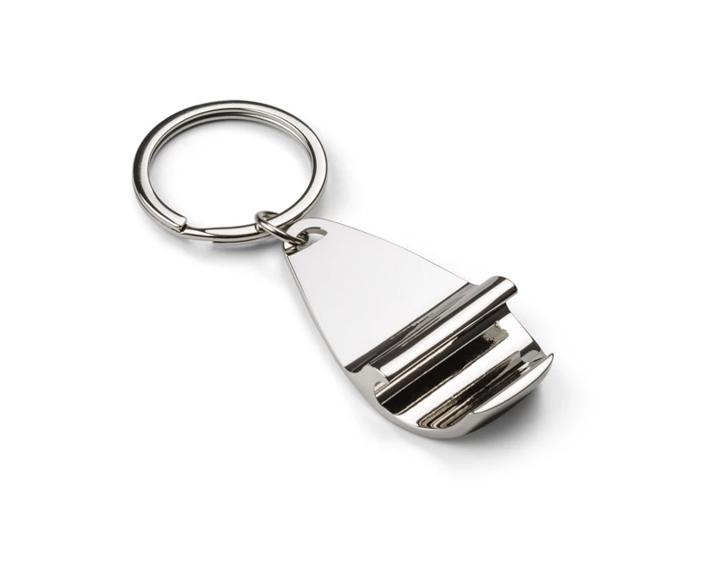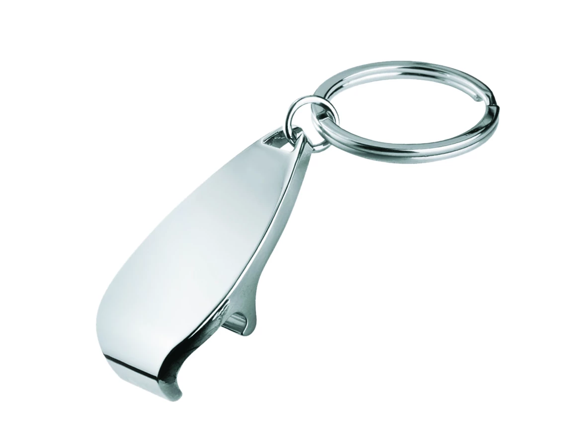 Brelok do kluczy w funkcją otwieracza, wykonany z chromowanego metalu.