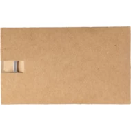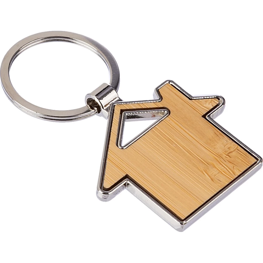 Brelok "domek", zapakowany w kartonik kraftowy, produkt wykonany z bambusa z metalowymi elementami