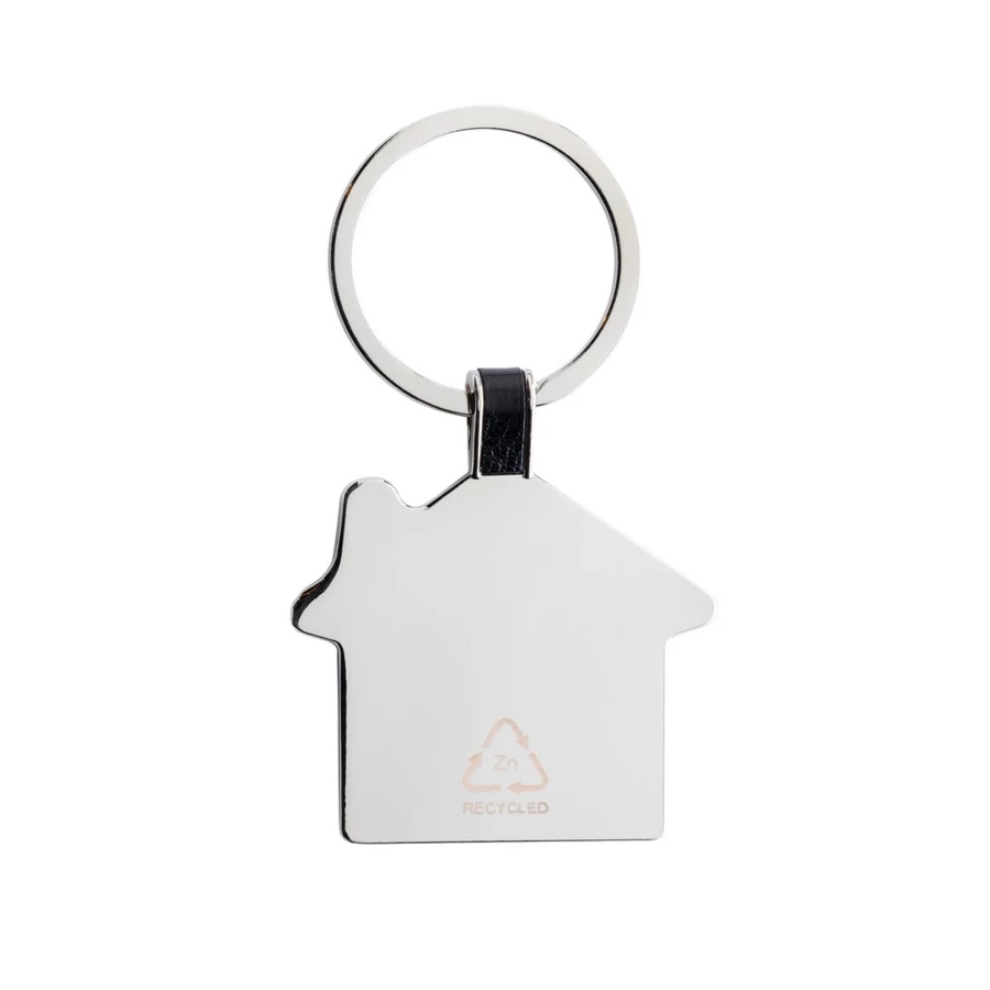 Brelok do kluczy „domek”, wykonany z metalu pochodzącego z recyklingu, całkowita zawartość materiałów z recyklingu obliczona w oparciu o wagę całkowitą przedmiotu: 84%, w pudełku z certyfikatem FSC® mix