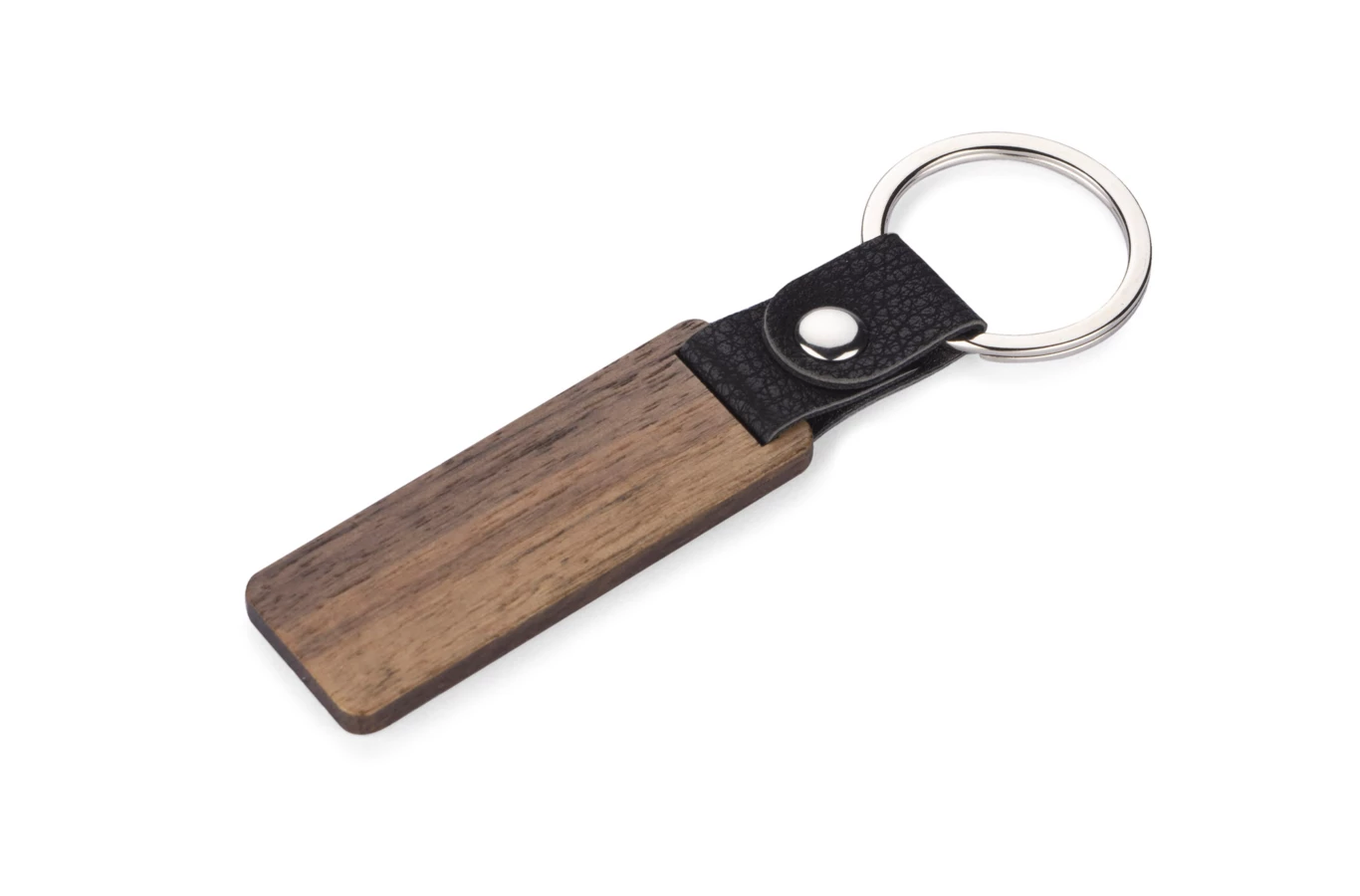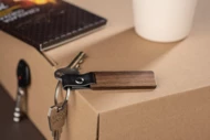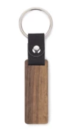 Brelok HASEL to elegancki brelok wykonany z drewna orzechowego. Metalowa obręcz zawieszona jest na skórzanym pasku.