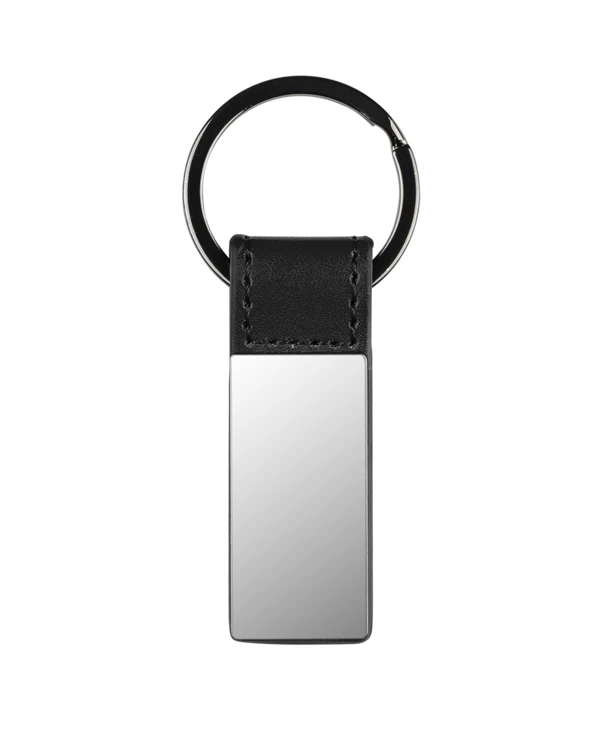 Elegancki dwustronny brelok wykonany z materiału skóropodobnego PU i metalu w kolorze grafitowym. Logo wygrawerujemy na metalowej blaszce.