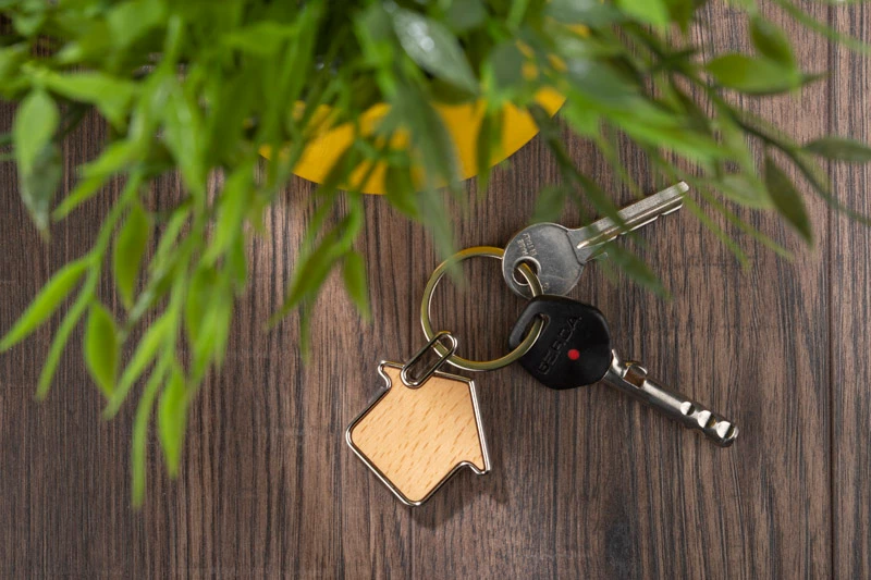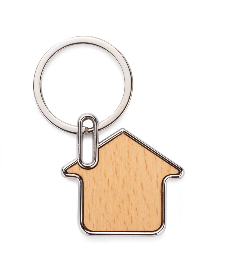 Brelok KUKA w kształcie domku, wykonany jest ze stopu cynku i drewna. Jest lekki i wygodny w użyciu. Drewniany brelok prezentuje się bardzo oryginalnie, a w połączeniu z metalem zyskuje elegancję. Pakowany w brązową, papierową kopertę