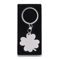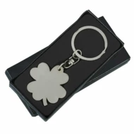 Metalowy brelok w kształcie czterolistnej koniczynki. Popularny symbol szczęścia. Pakowany w czarne opakowanie upominkowe.