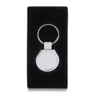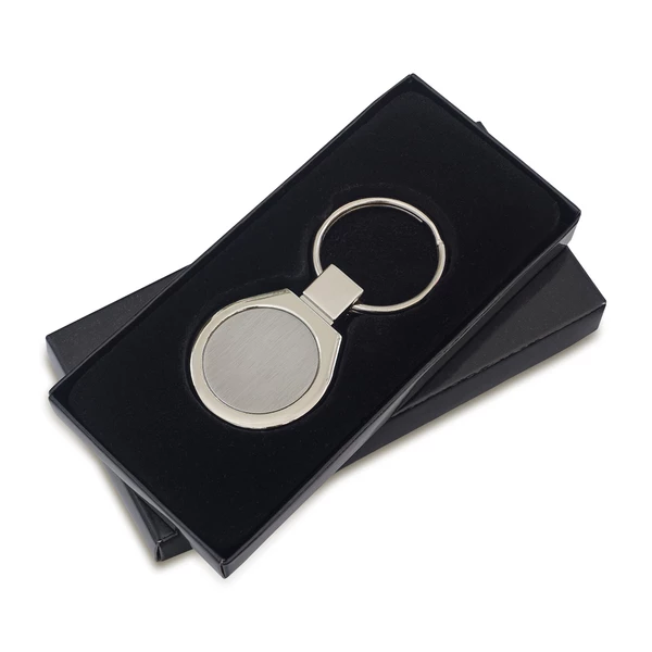 Brelok z łączonego matowego i błyszczącego metalu. Doskonale nadaje się na akcje promocyjne. Pakowany w czarne kartonowe opakowanie upominkowe.