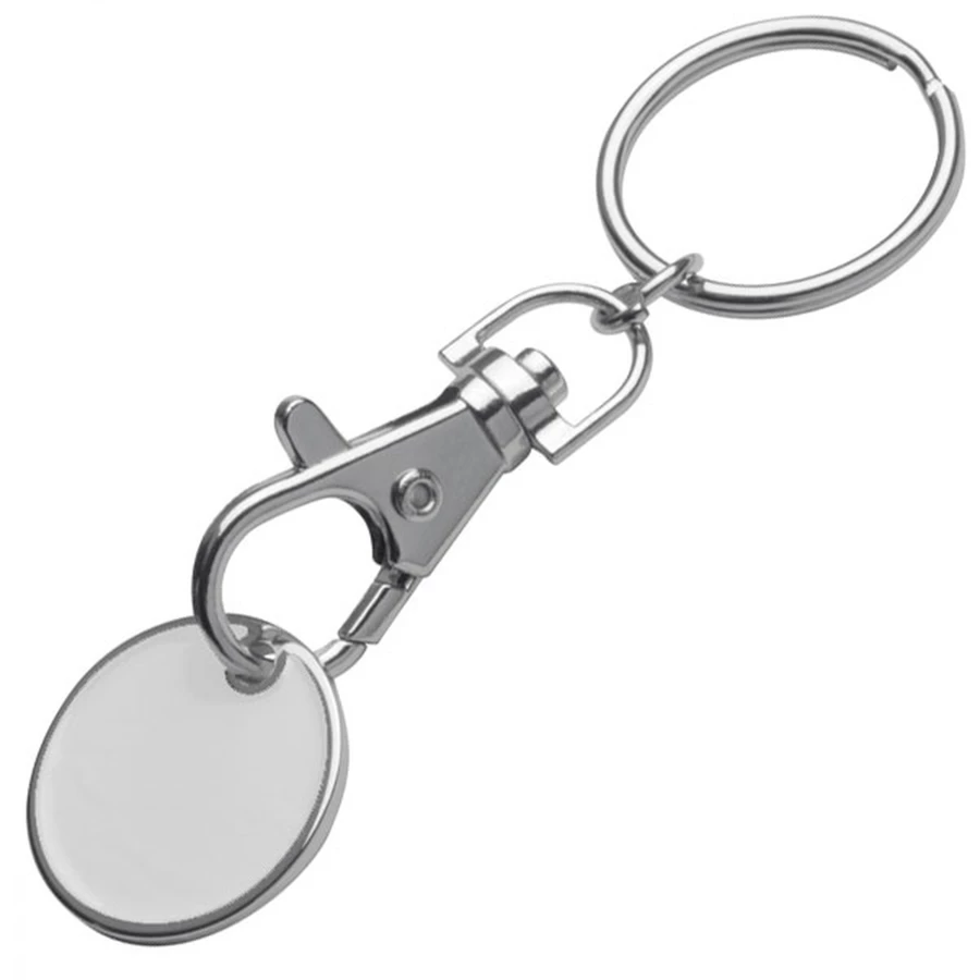 Metalowy brelok karabińczykiem i żetonem do wózka. Produkt dostępny w kilku kolorach.