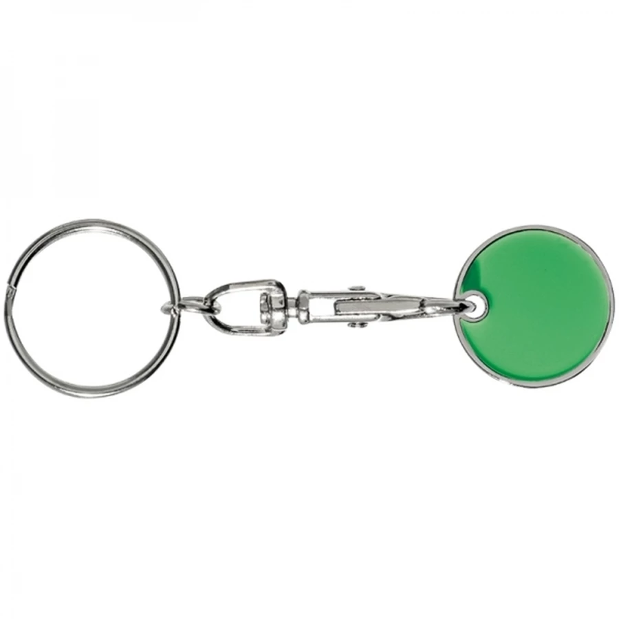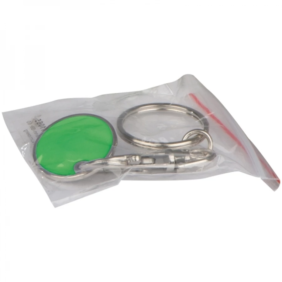 Metalowy brelok karabińczykiem i żetonem do wózka. Produkt dostępny w kilku kolorach.