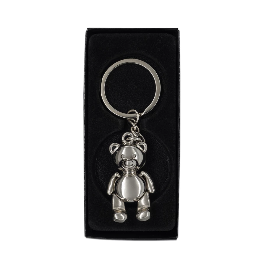 Brelok w kształcie misia z ruchomymi łapkami. Pakowany w czarne pudełko upominkowe.