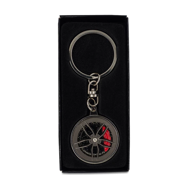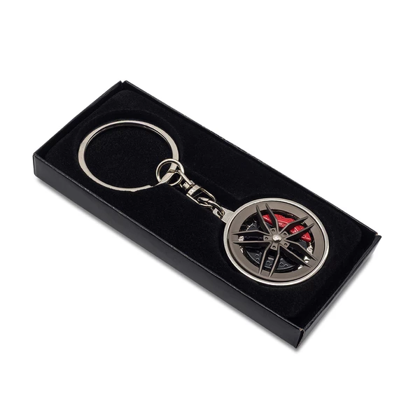 Idealny gadżet dla każdego miłośnika motoryzacji! Brelok w kształcie felgi z detalami układu hamulcowego. Pakowany w czarne pudełko upominkowe.