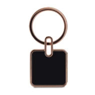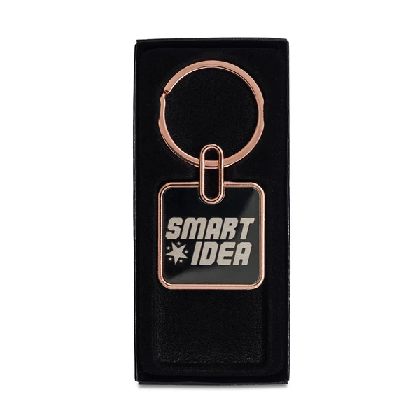 Elegancki metalowy brelok z wykończeniem w kolorze różowego złota. Błyszczący środek w kolorze grafitowym. Pakowany w czarne pudełko upominkowe.