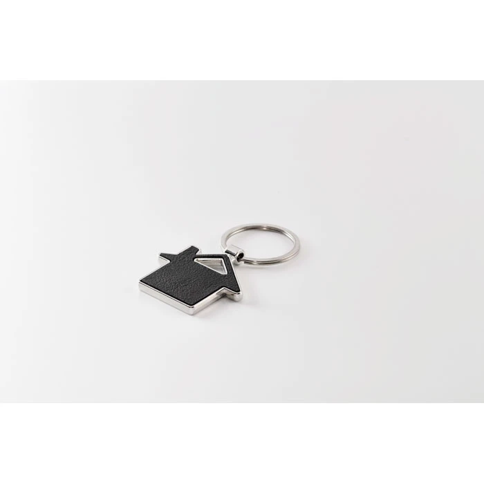 Metalowy brelok w kształcie domu z wkładką z recyklingowanej skóry PU.