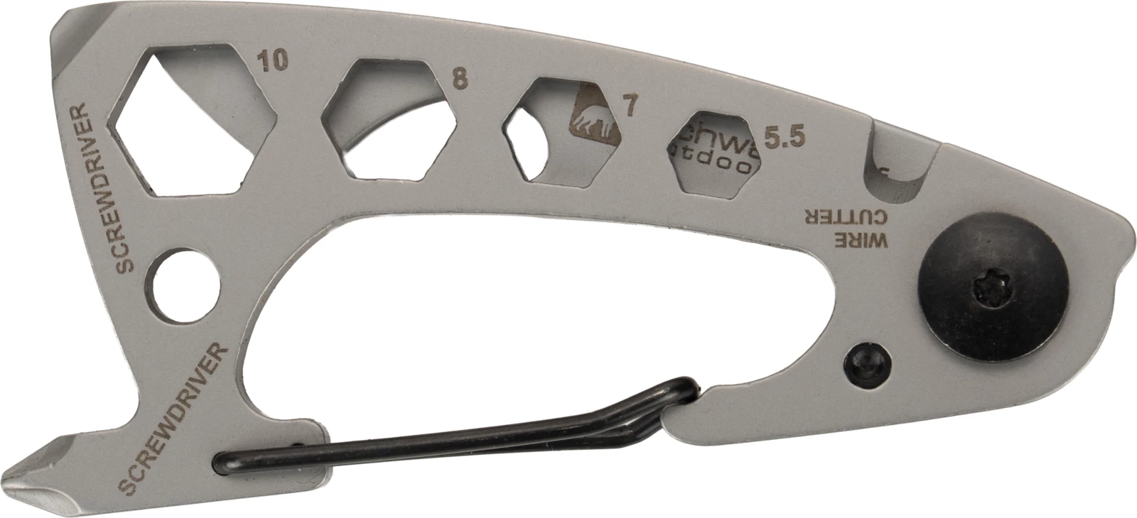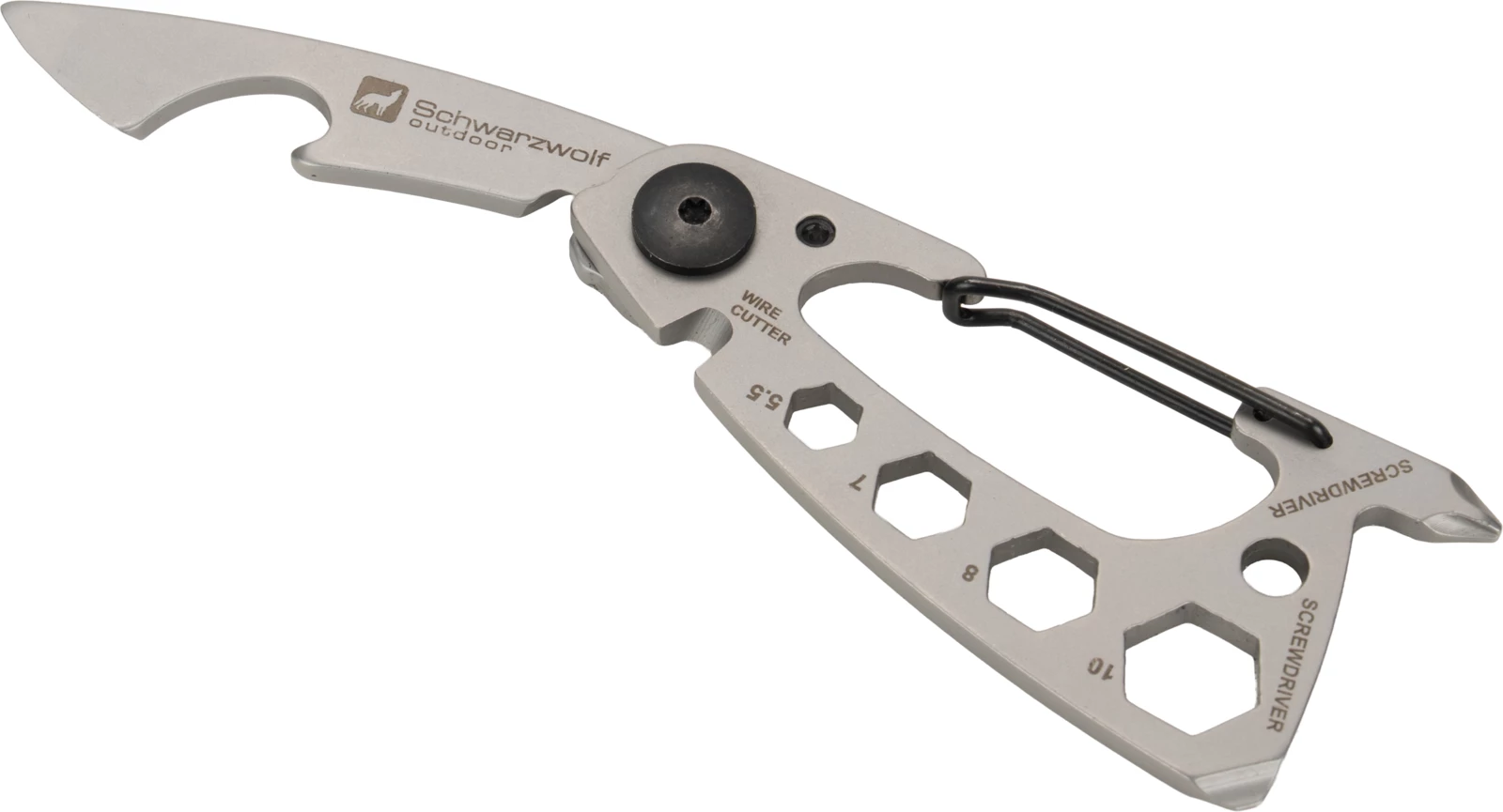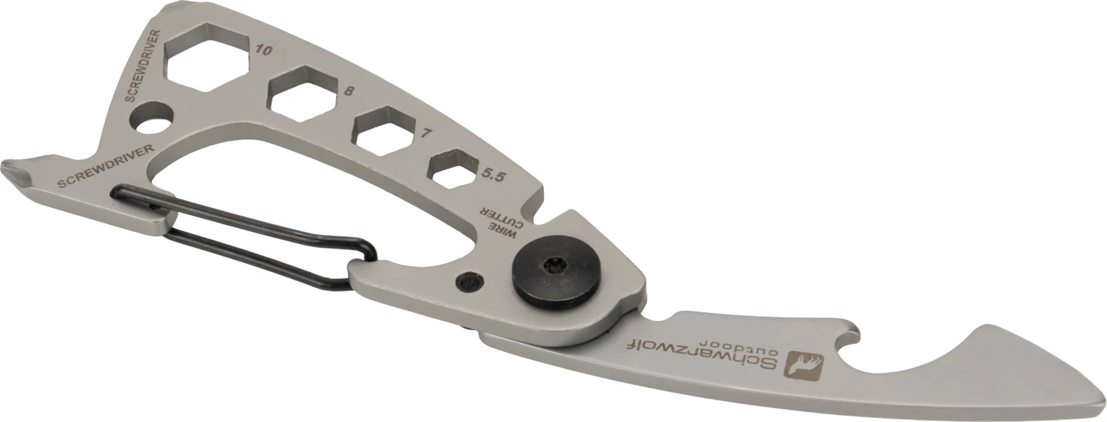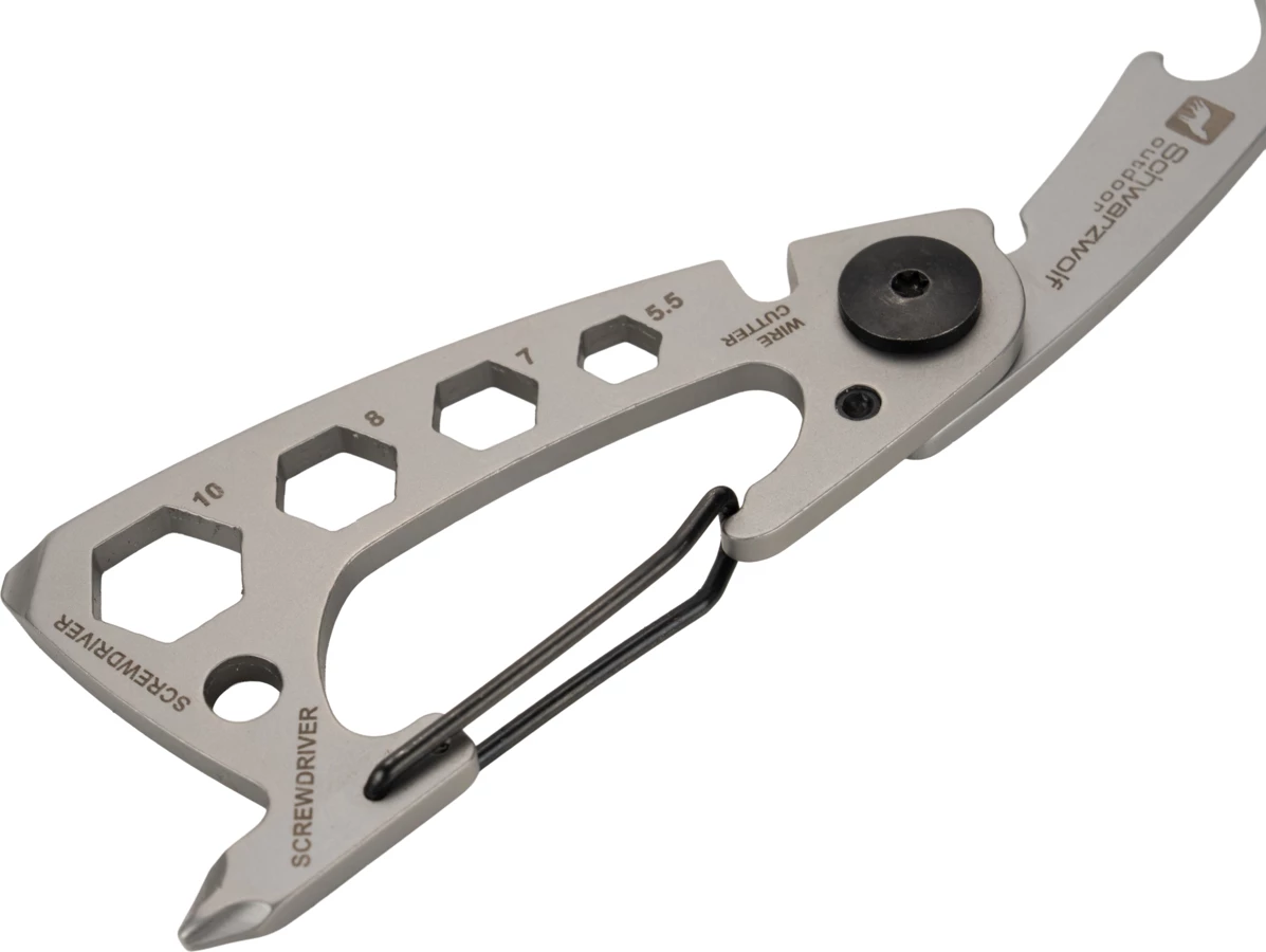 Wielofunkcyjny brelok marki Schwarzwolf zawierający 10 różnych narzędzi - otwieracz do butelek, karabińczyk, wielofunkcyjny otwieracz, przecinak do drutu, płaski śrubokręt, śrubokręt Philips oraz klucz do nakrętek w 4 rozmiarach.
