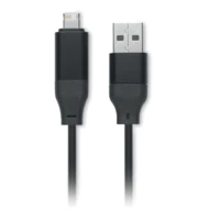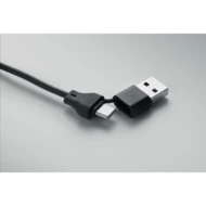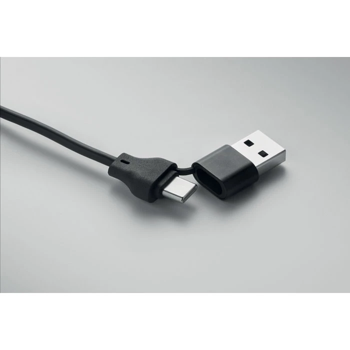 Kabel do ładowania 4 w 1 z bambusowymi detalami. Wejście: 2-w-1 Typ-C i Typ-A. Wyjście: Ładowanie zegarka (Samsung® i Apple®), typ-C i micro-B (2 w 1 pin).