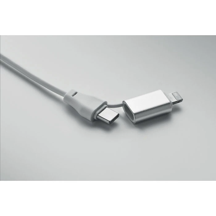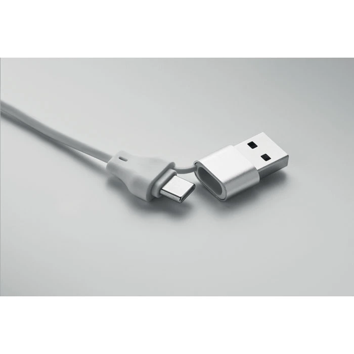 Kabel do ładowania 4 w 1 z bambusowymi detalami. Wejście: 2-w-1 Typ-C i Typ-A. Wyjście: Ładowanie zegarka (Samsung® i Apple®), typ-C i micro-B (2 w 1 pin).