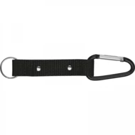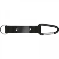 Metalowy brelok do kluczy z karabińczykiem na poliestrowej taśmie.