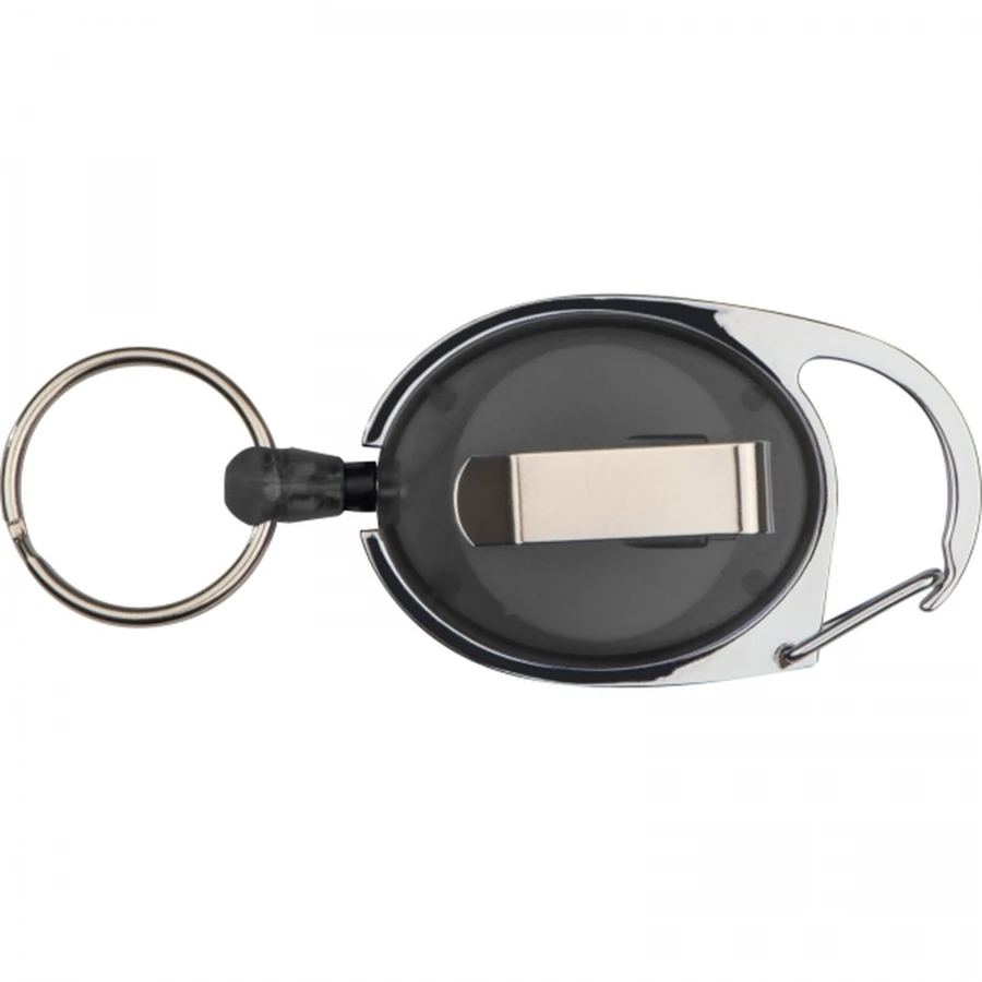 Plastikowy brelok z metalowym karabińczykiem, klipsem do paska oraz kółkiem na zwijanej lince.