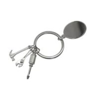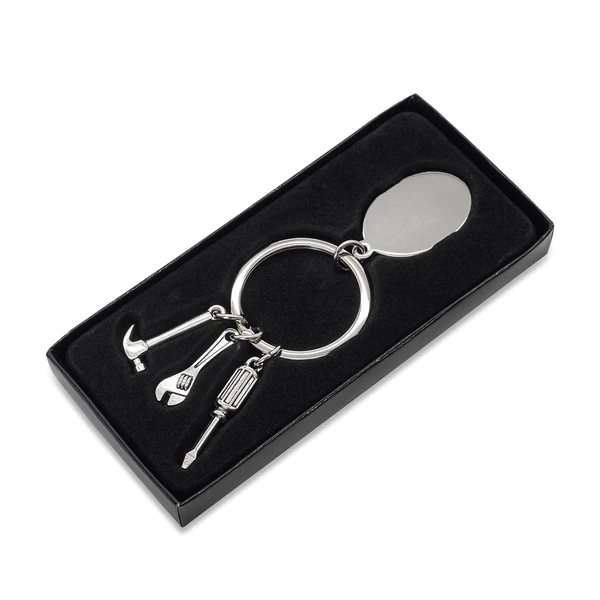 Metalowy brelok z elementami w kształcie narzędzi. Zawiera 3 zawieszki: śrubokręt, klucz francuski i młotek oraz płytkę idealna pod grawer. Pakowany w czarne opakowanie upominkowe.