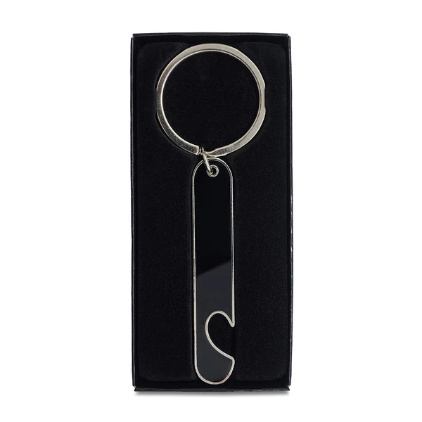 Brelok o czarnej błyszczącej powierzchni, z funkcją otwieracza. Pakowany w czarne pudełko upominkowe.
