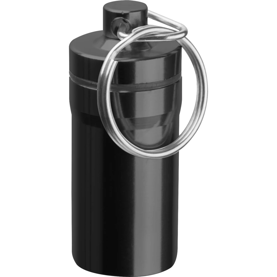 Brelok pojemnik z zewnętrzną powłoką ze stali nierdzewnej oraz wnętrzem z tworzywa sztucznego. Idealny do bezpiecznego przechowywania drobnych przedmiotów w podróży.