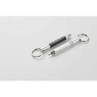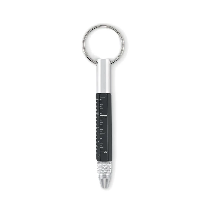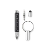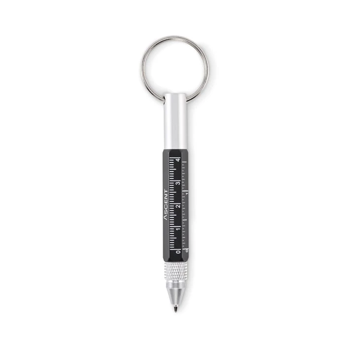 Brelok do kluczy z przekręcanym długopisem z aluminium pochodzącego z recyklingu z linijką 4 cm i 1,5 cala, rysikiem i śrubokrętem 2 w 1 z łbem krzyżakowym i płaskim. Czarny tusz.