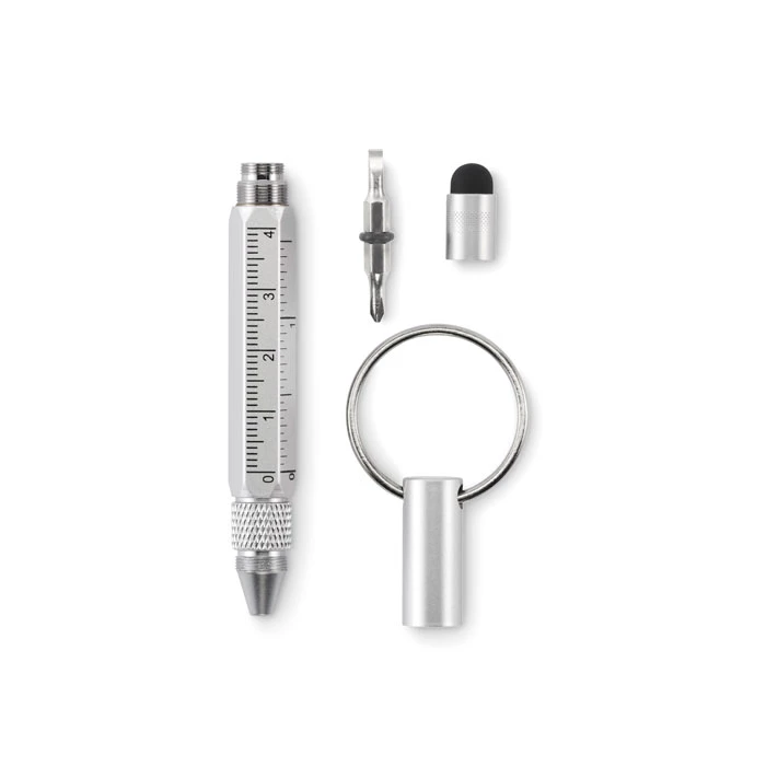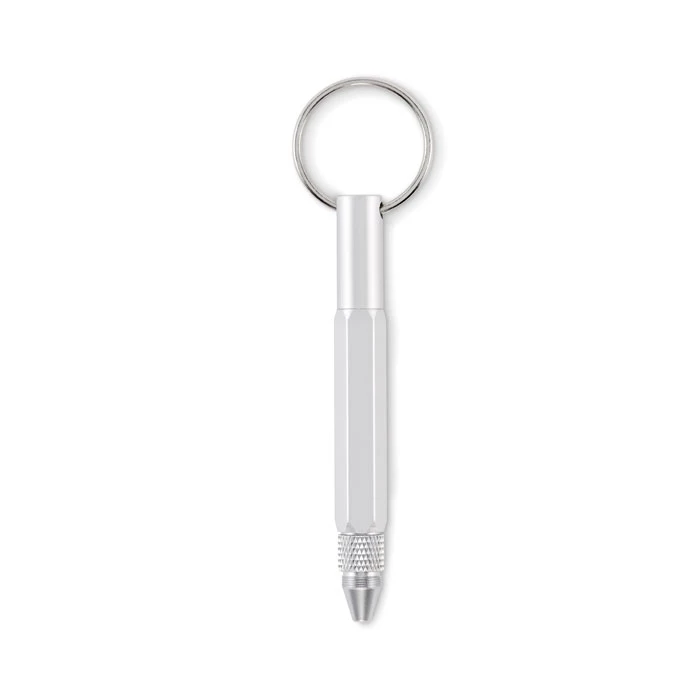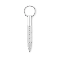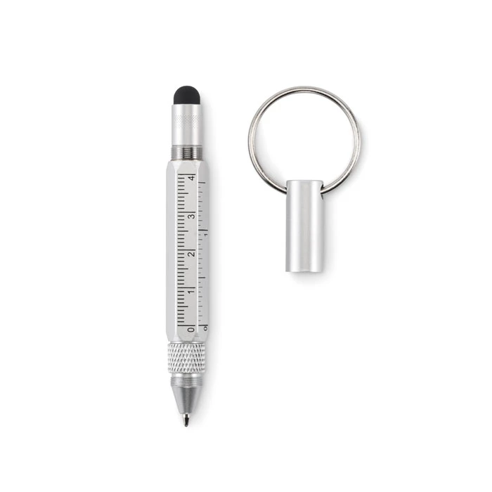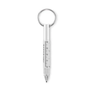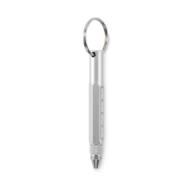 Brelok do kluczy z przekręcanym długopisem z aluminium pochodzącego z recyklingu z linijką 4 cm i 1,5 cala, rysikiem i śrubokrętem 2 w 1 z łbem krzyżakowym i płaskim. Czarny tusz.