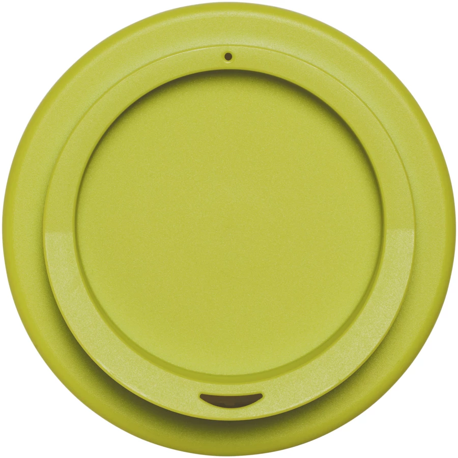 Dwuścienny, izolowany kubek z nakręcaną pokrywką i pełnokolorowym wzorem na całej powierzchni dopasowanym do produktu. Wykonany w 70% z materiału pochodzącego z recyklingu (kubek z materiałów z recyklingu i czarna wkładka) i ma standardową pokrywkę z tworzywa PP. Kubek w pełni nadaje się do recyklingu i można go używać w zmywarce i kuchence mikrofalowej. Pojemność wynosi 350 ml i nie zawiera BPA. Zapakowana w torbę, którą można kompostować w domu. Wyprodukowano w Wielkiej Brytanii.