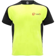 Techniczny i oddychający materiał. Okrągły dekolt z pasującymi krytymi szwami. Raglanowe rękawy i kontrastowe panele boczne. Usuwalna etykieta.