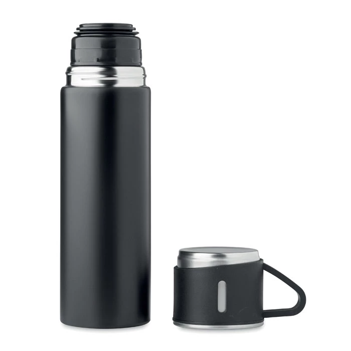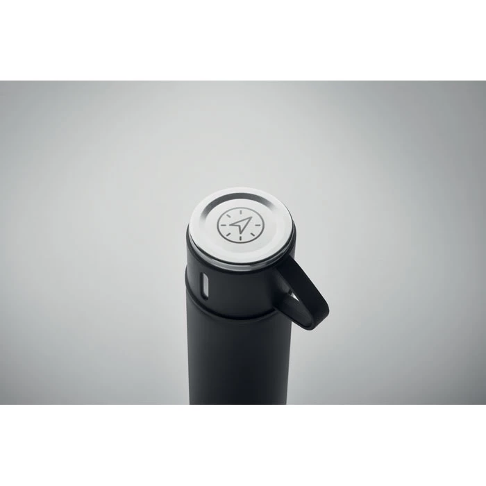 Dwuścienny termos ze stali nierdzewnej ze szczelną zakrętką i kubkiem. Pojemność: termos 420 ml, kubek 150 ml.