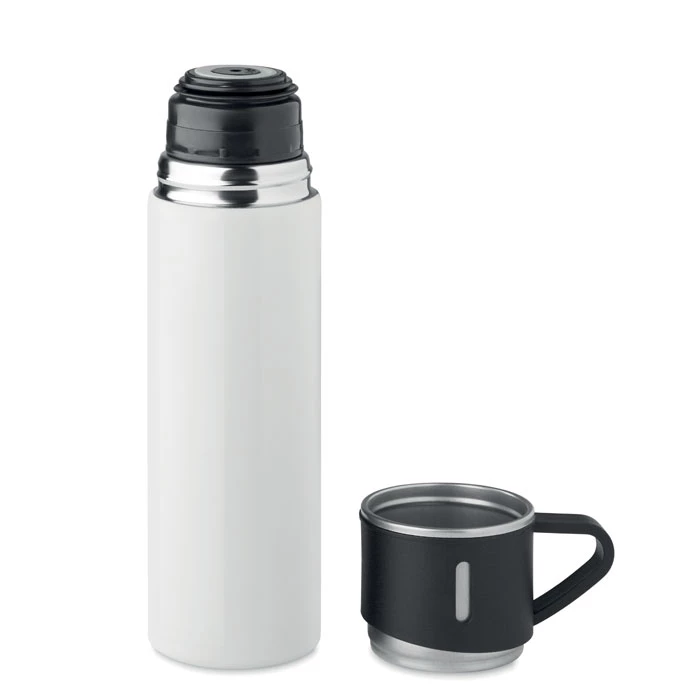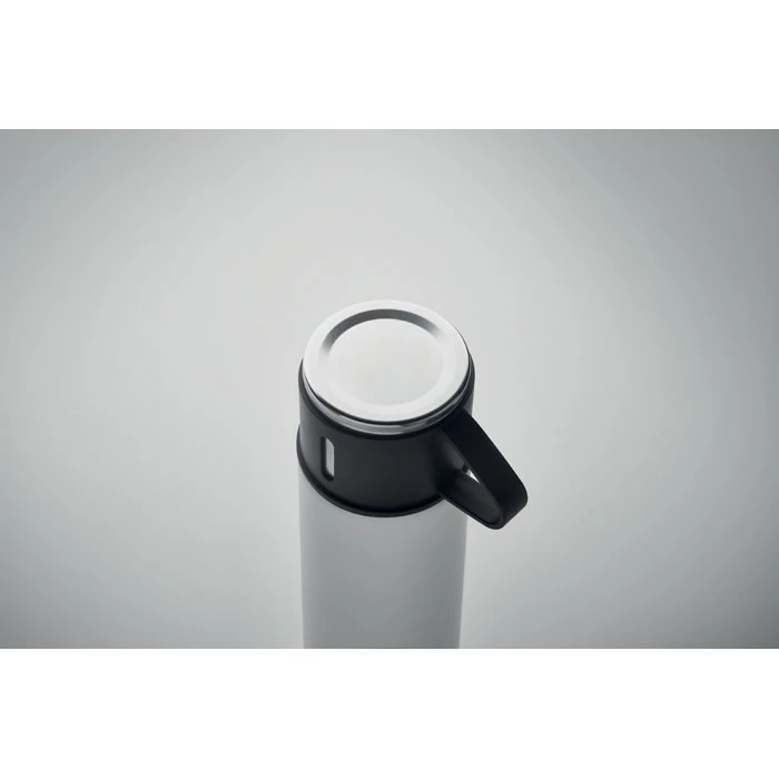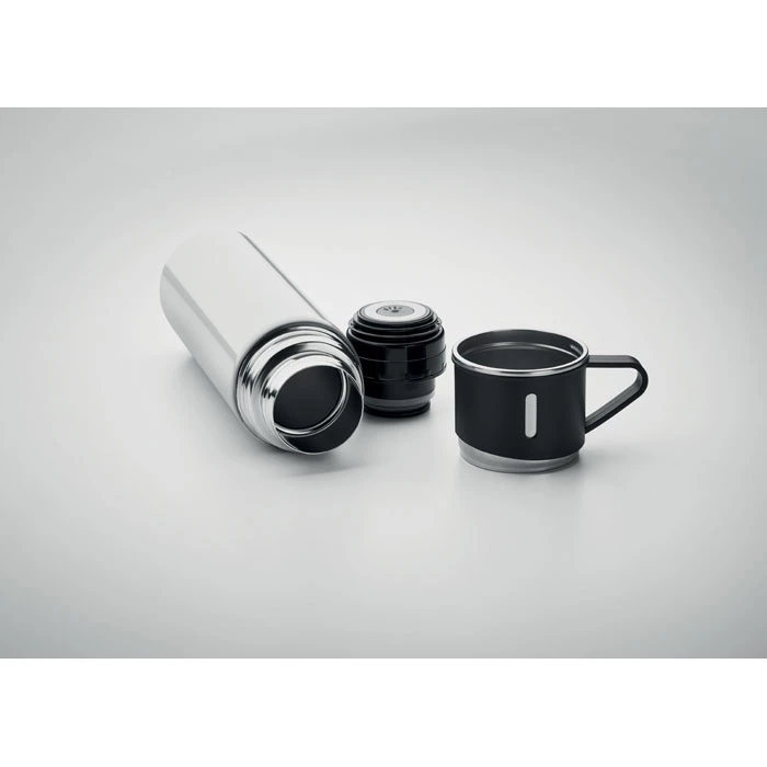 Dwuścienny termos ze stali nierdzewnej ze szczelną zakrętką i kubkiem. Pojemność: termos 420 ml, kubek 150 ml.