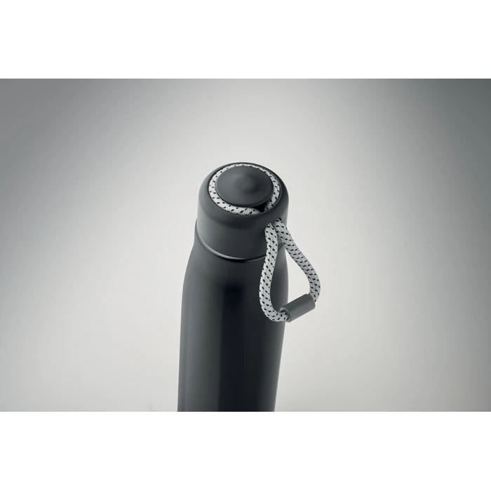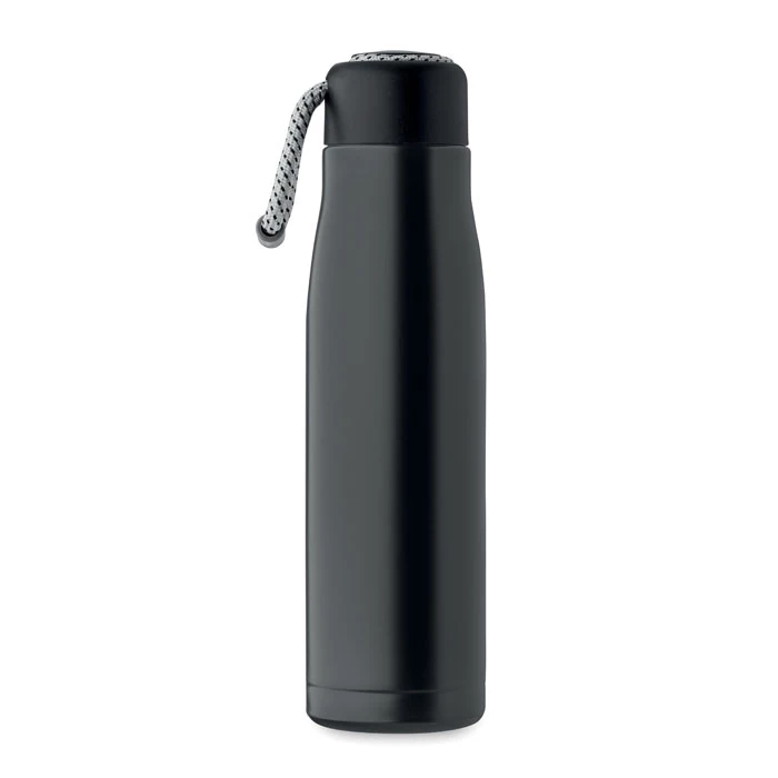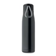 Izolowana próżniowo butelka z podwójnymi ściankami z recyklingowanej stali nierdzewnej (90% z recyklingowanej stali nierdzewnej i 10% ze stali nierdzewnej) ze zintegrowanym uchwytem sznurkowym w zakrętce z PP. Nie przecieka. Pojemność: 500 ml.