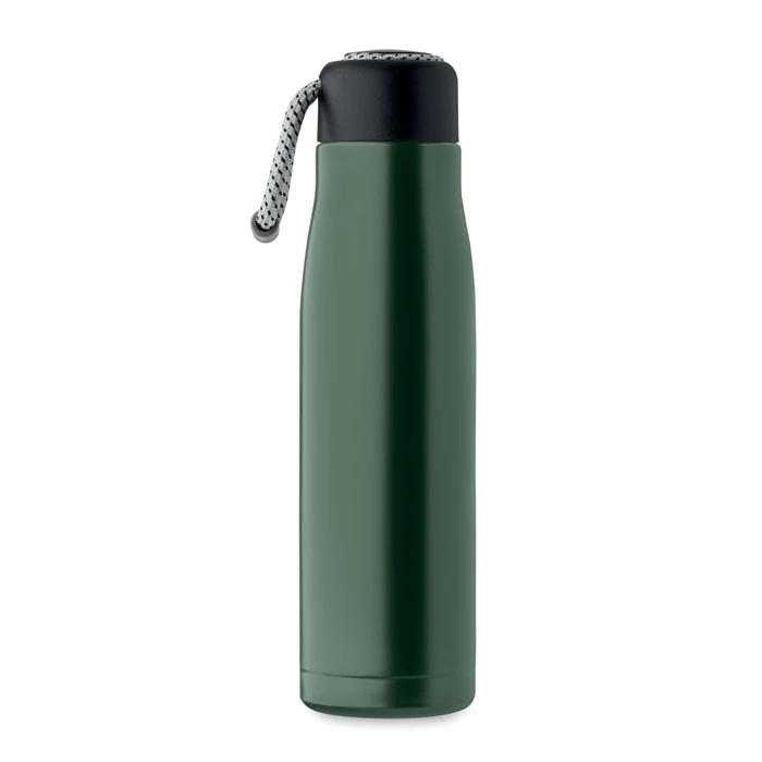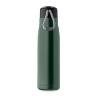 Izolowana próżniowo butelka z podwójnymi ściankami z recyklingowanej stali nierdzewnej (90% z recyklingowanej stali nierdzewnej i 10% ze stali nierdzewnej) ze zintegrowanym uchwytem sznurkowym w zakrętce z PP. Nie przecieka. Pojemność: 500 ml.