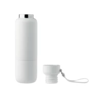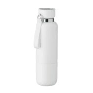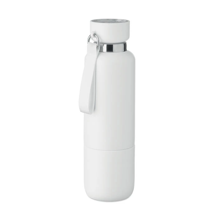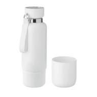 Dwuścienna izolowana butelka wykonana w 90% ze stali nierdzewnej pochodzącej z recyklingu i w 10% ze stali nierdzewnej, ze zintegrowanym uchwytem z paskiem i dodatkowym długim paskiem (70 cm) w pokrywie z PP. Nie przecieka. W zestawie dolny kubek. Pojemność: 500 ml.