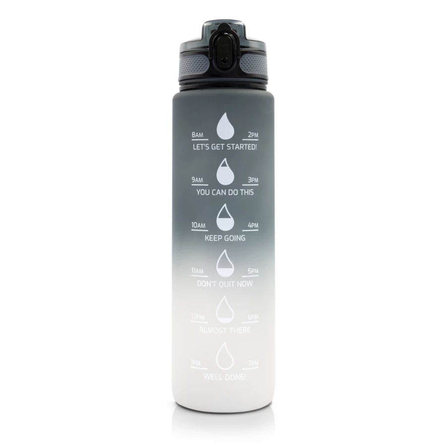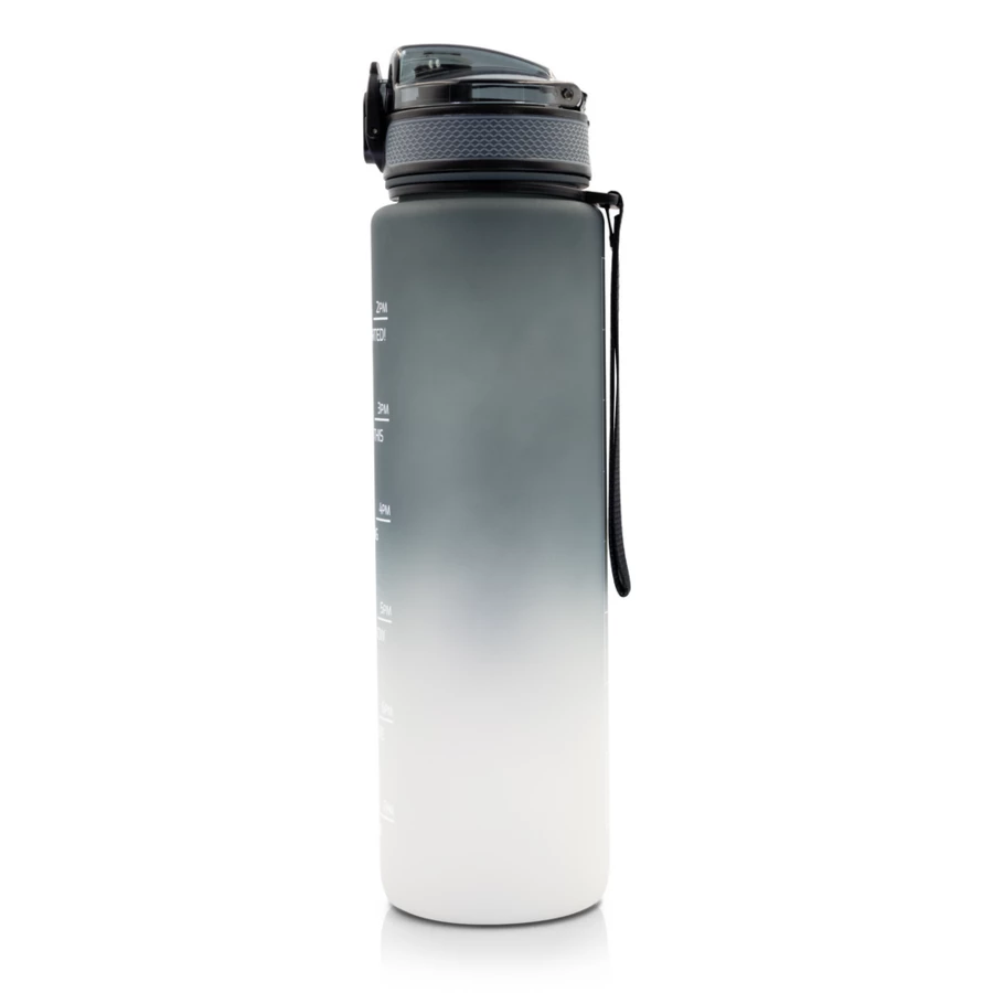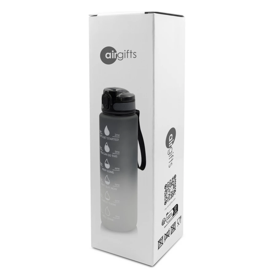 Butelka motywacyjna 1000 ml Air Gifts, skala ml z jednej strony i podziałka motywacyjna z drugiej strony, zamknięcie z blokadą, pasek na rękę (pakowany oddzielnie), gumowane wykończenie, przeznaczona wyłącznie do zimnych i niegazowanych napojów