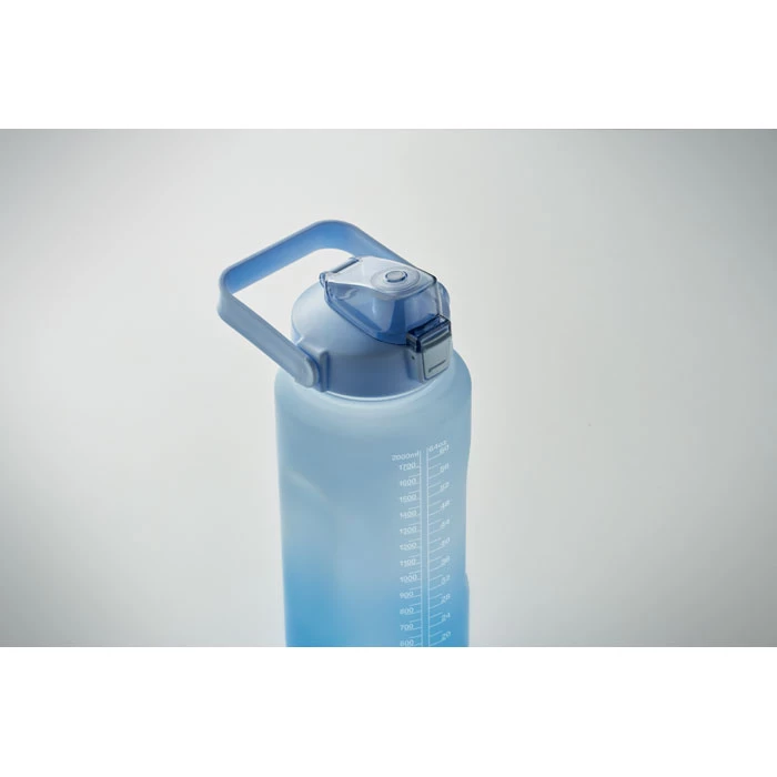 Motywacyjna butelka na wodę z RPET. Posiada otwieraną jedną ręką klapkę ze słomką, blokadę bezpieczeństwa i uchwyt. Nie przecieka. Pojemność: 2000 ml