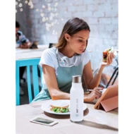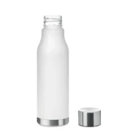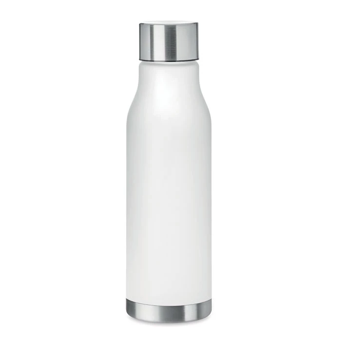 Butelka z RPET z gumowanym wykończeniem, zakrętka ze stali nierdzewnej z silikonowym pierścieniem. Bez BPA. Szczelna. Pojemność: 600 ml. Nie nadaje się do napojów gazowanych.