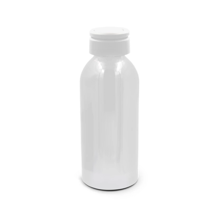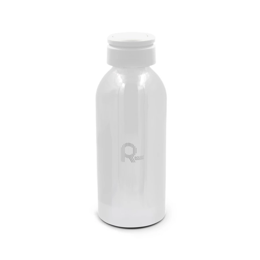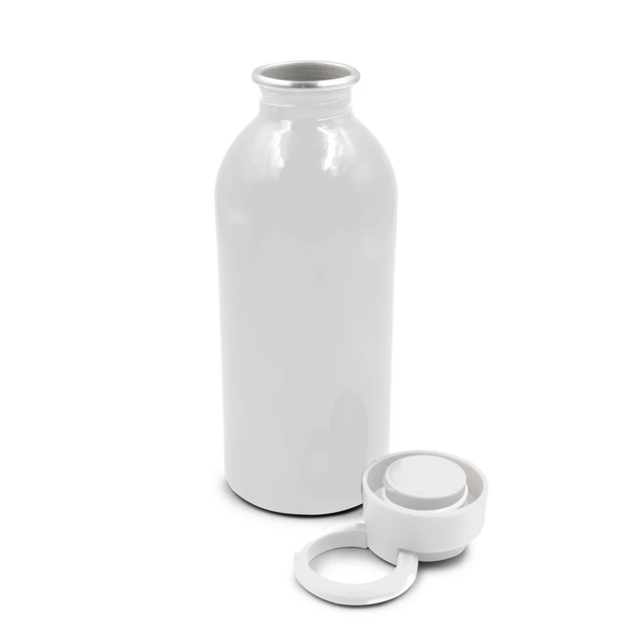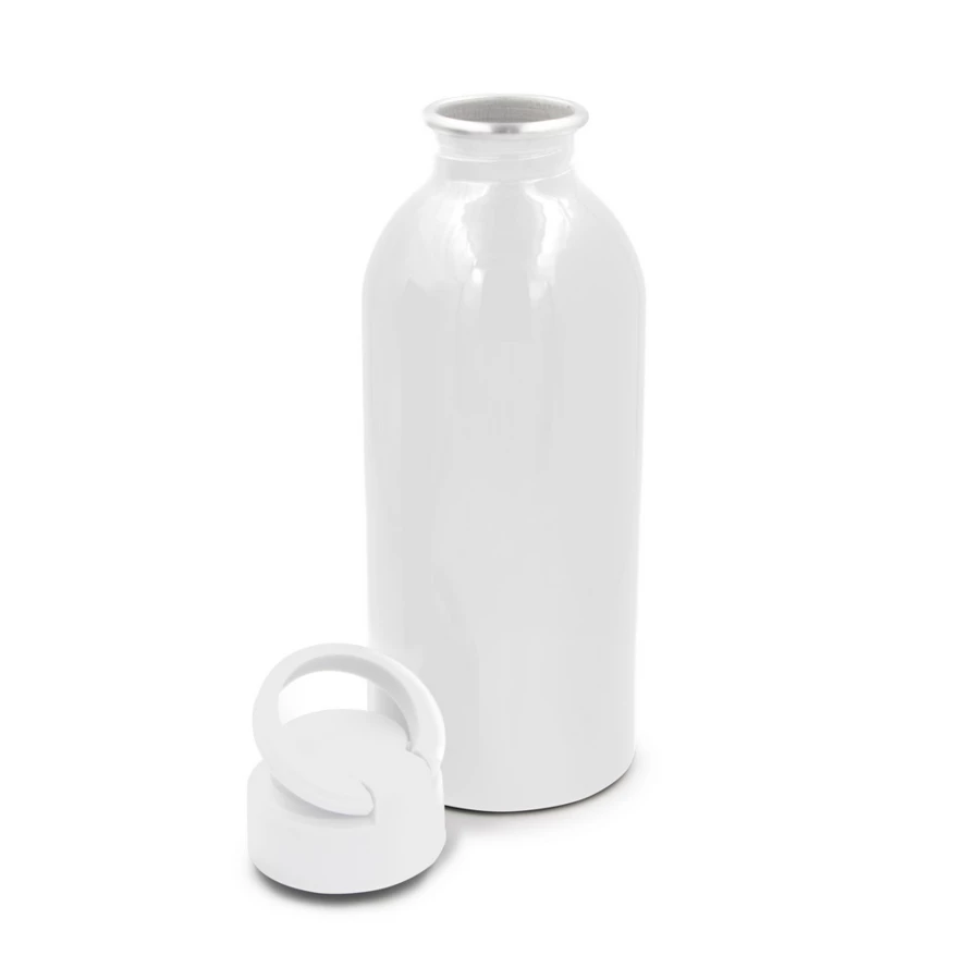 Sportowa butelka 585 ml, posiada plastikową zakrętkę ze składanym uchwytem ułatwiającym noszenie, zalecana wyłącznie do zimnej wody, produkt wykonany z aluminium