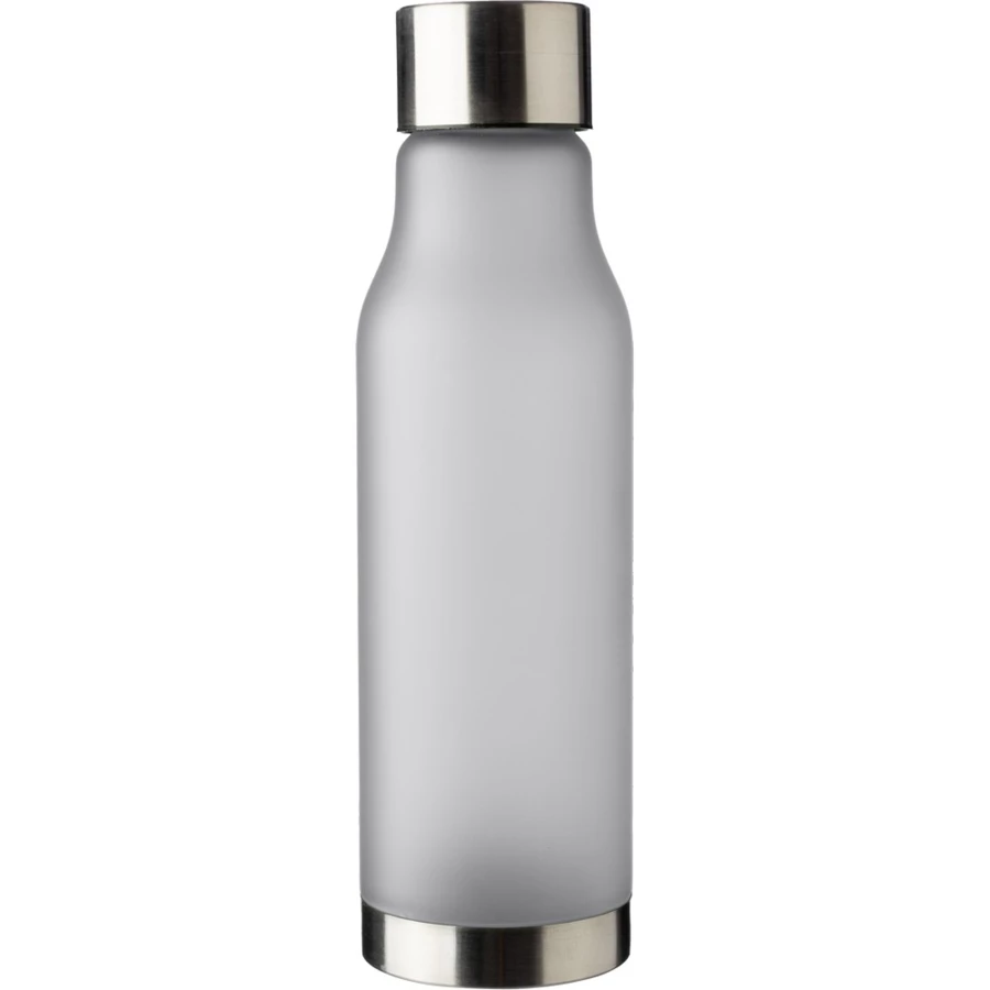 Butelka sportowa 600 ml z pokrywką i dnem ze stali nierdzewnej, posiada gumowe wykończenie nadające matowego wyglądu, produkt wykonany z RPET
