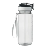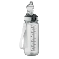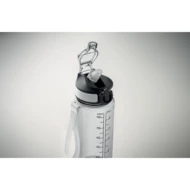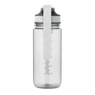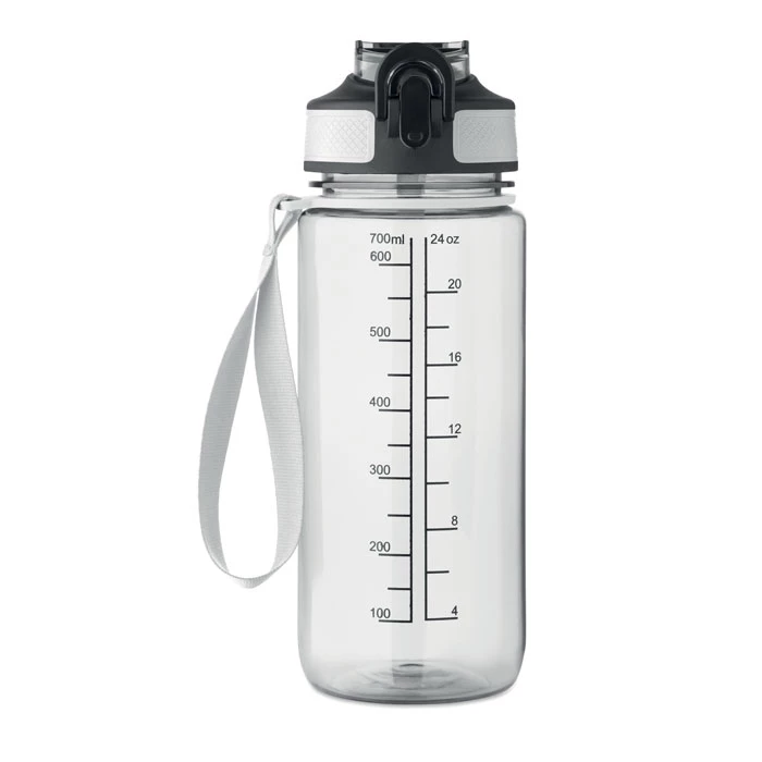 Motywacyjna butelka z RPET ze zintegrowaną słomką, miękkim silikonowym ustnikiem, otwieraną jedną ręką pokrywką, blokadą bezpieczeństwa. Z satynowym paskiem z RPET. Pojemność 700 ml. Nie przecieka.