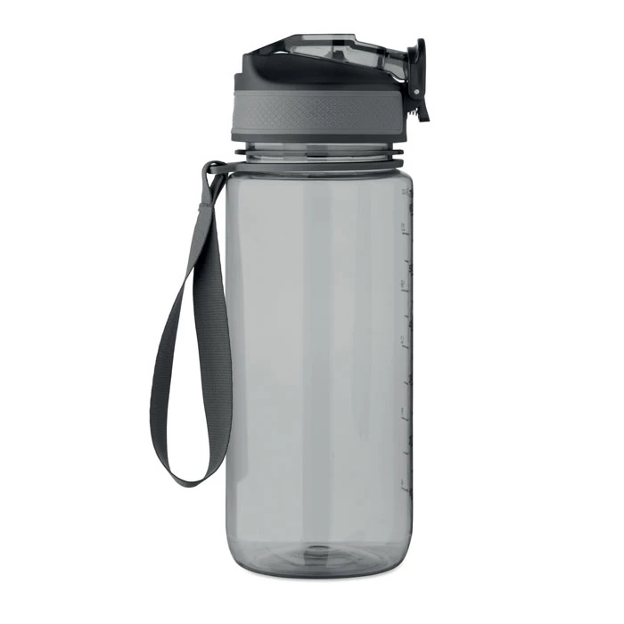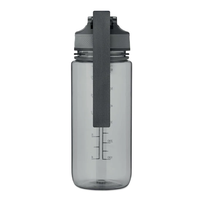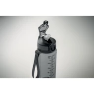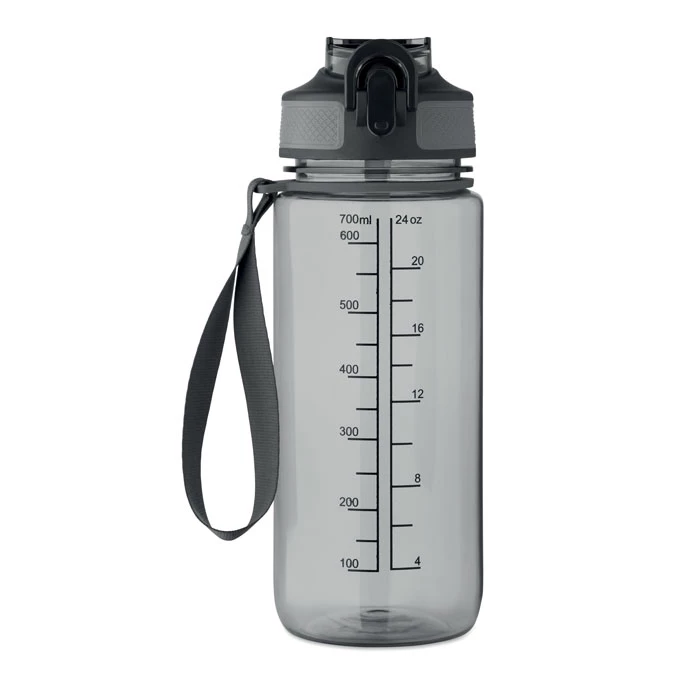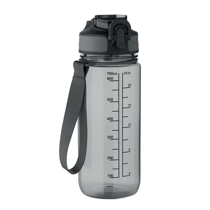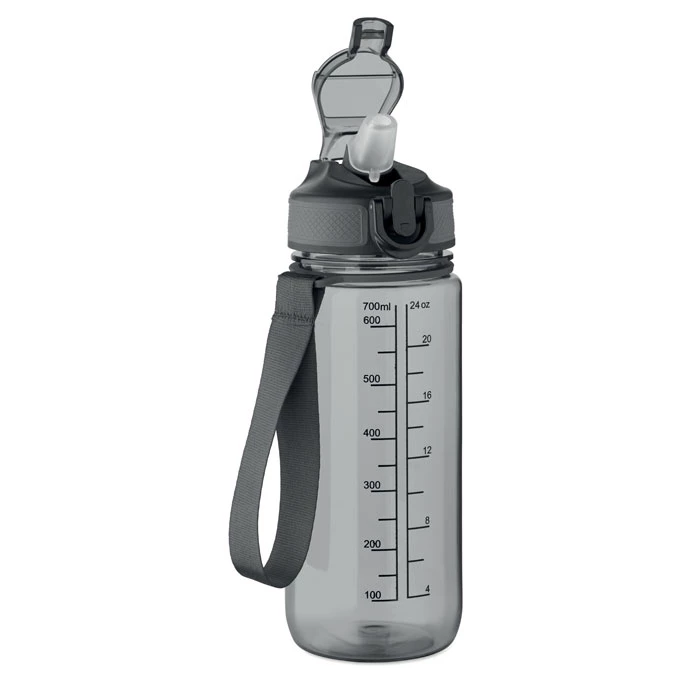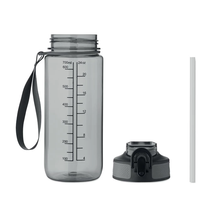 Motywacyjna butelka z RPET ze zintegrowaną słomką, miękkim silikonowym ustnikiem, otwieraną jedną ręką pokrywką, blokadą bezpieczeństwa. Z satynowym paskiem z RPET. Pojemność 700 ml. Nie przecieka.