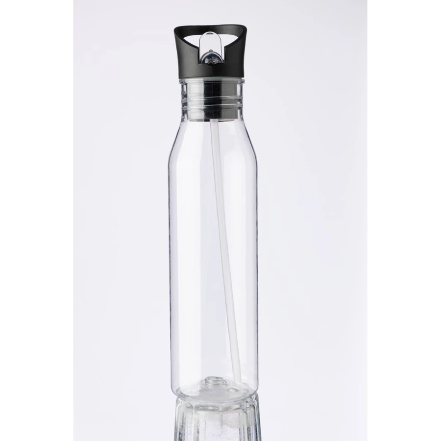 Butelka sportowa 730 ml ze składanym ustnikiem i słomką do wygodnego picia napoju w środku, uchwyt ułatwiający noszenie połączony z zakrętką, polecana do zimnych i niegazowanych napojów, produkt wykonany z RPET