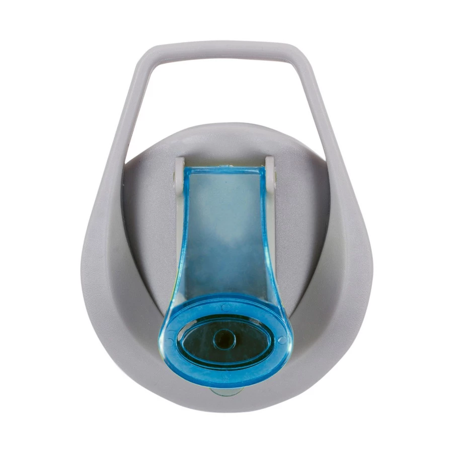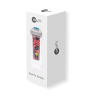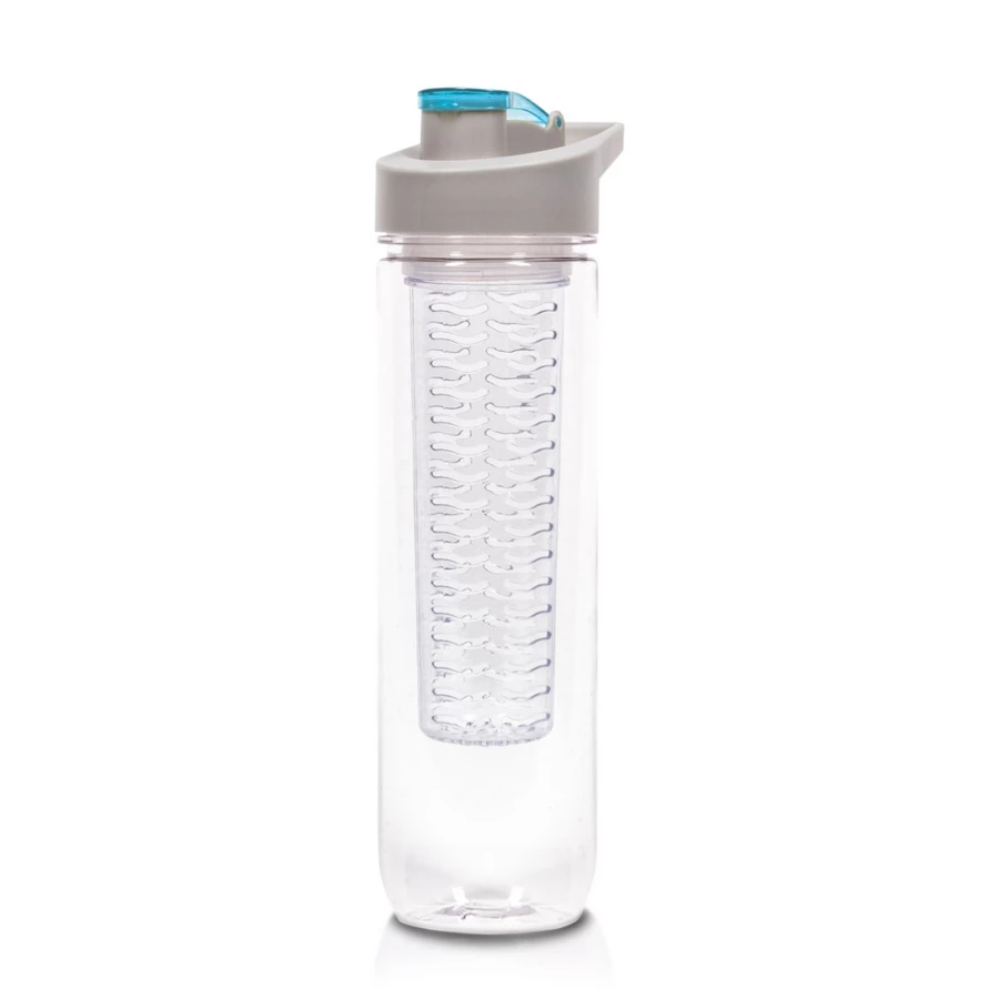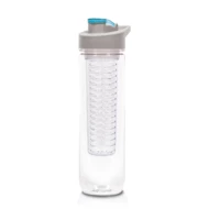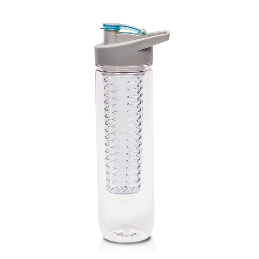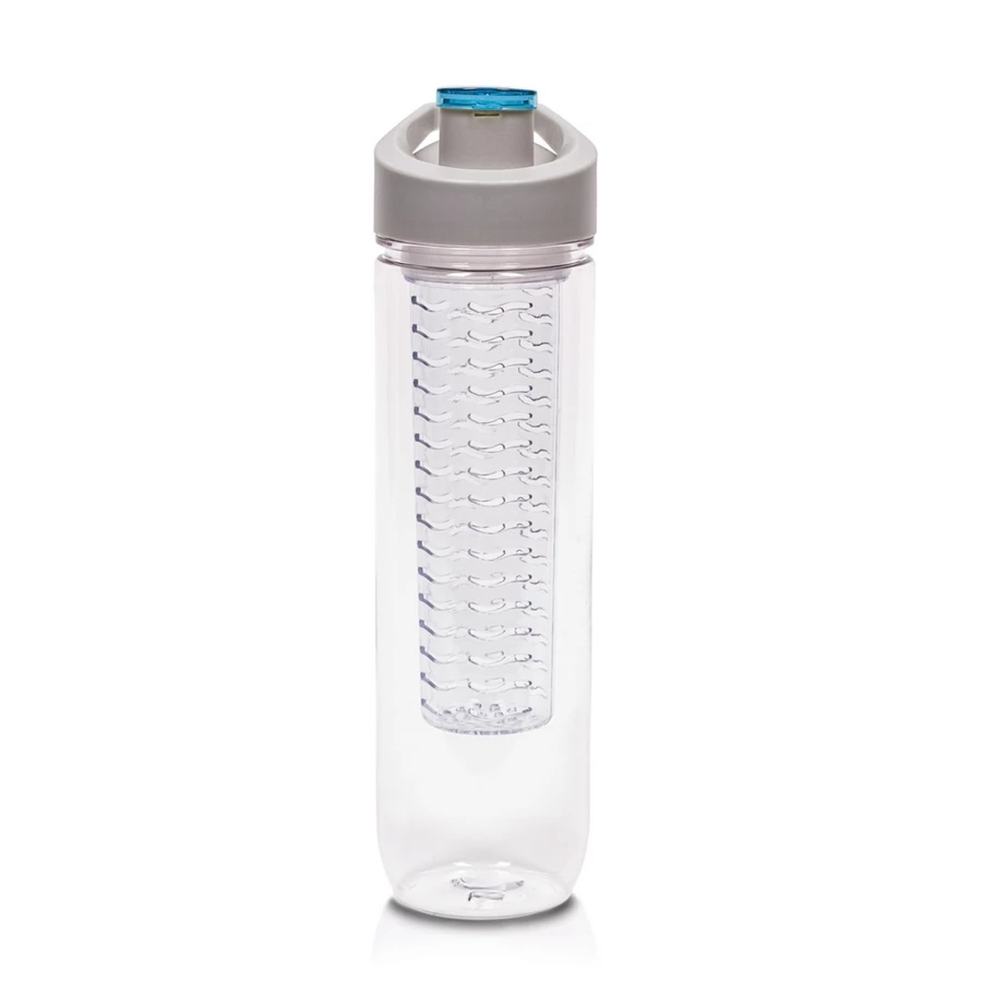 Butelka sportowa 800 ml Air Gifts, posiada pojemnik na lód lub owoce umożliwiający nadanie wodzie smaku według własnych preferencji, szara zakrętka z uchwytem ułatwiającym noszenie i kolorowym zamknięciem, butelka przeznaczona wyłącznie do zimnych i niegazowanych napojów, produkt wykonany z Tritanu i PP