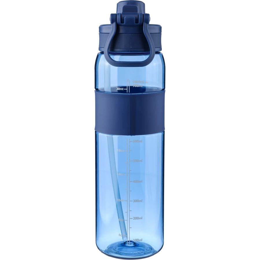 Butelka sportowa 900 ml z tritanu, ustnik i odkręcane wieczko, silikonowy pierścień, uchwyt ułatwiający noszenie, miarka z boku, zapakowana w kartonową wytłoczkę
