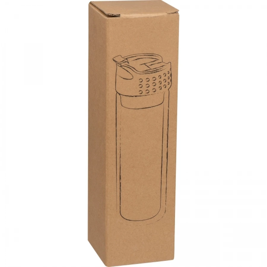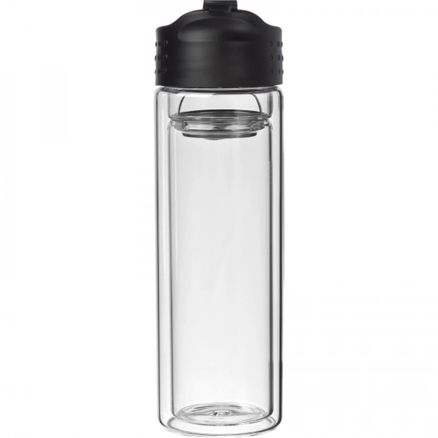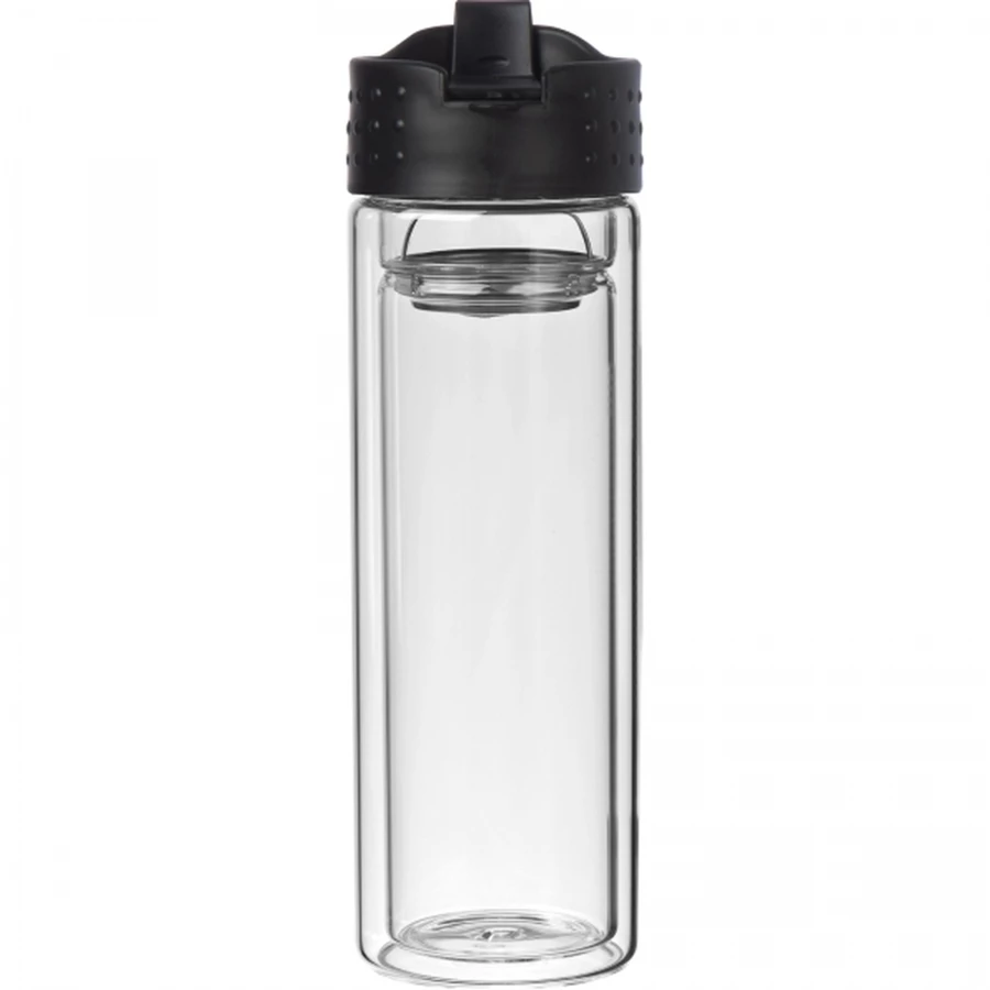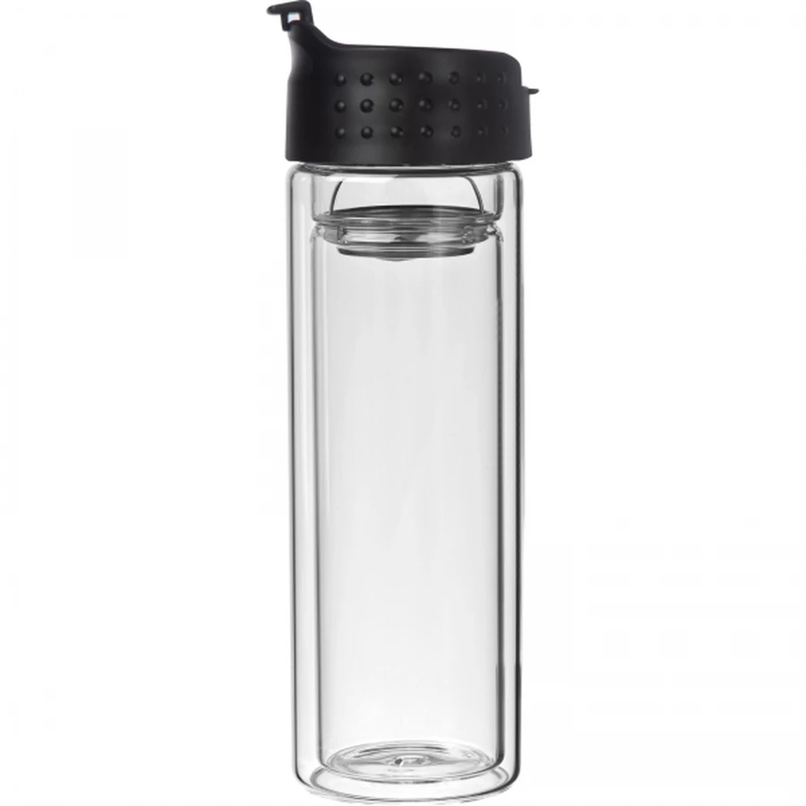 Butelka z podwójnymi ściankami, wykonana ze szkła, stali nierdzewnej i plastiku. Posiada sitko np. na herbatę. Pojemność 400 ml.